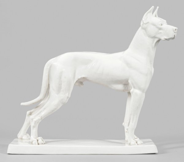 Altweiß, glasiert. Auf einem Rechtecksockel die naturalistische Darstellung einer Dogge mit aufgestellten Ohren und aufmerksamen Blick. Entw. Konrad Schmid, um 1928. Entw.-Bez. Modell-Nr. 641. Geprägte Manufakturmarke. H. 50 cm. L. 50 cm. B. 17 cm.