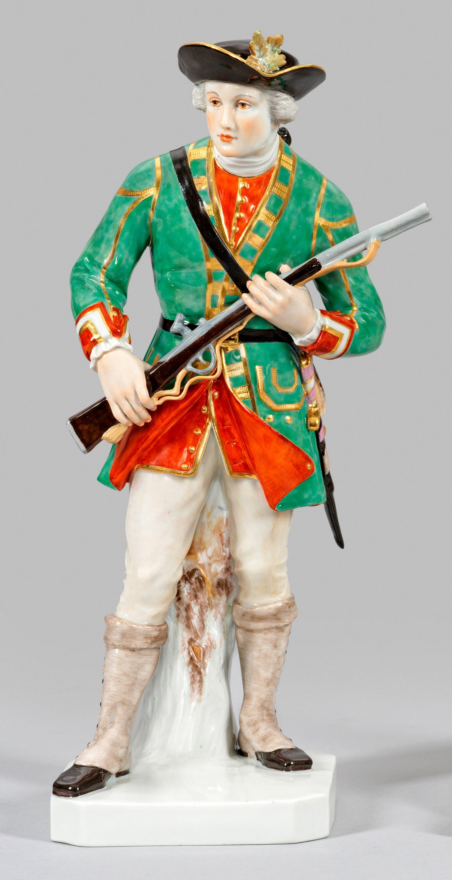 Auf rechteckig abgeschrägter Plinthe stehender Jäger mit Flinte, in seegrünem Jagdrock mit radierter Goldakzentuierung über roter, ornamental gesäumter Weste. Das Haar von einem schwarzen Hut bedeckt. Polychrome Malerei mit Goldstaffage. Entw. Robert Diez. Modell-Nr. H 182. Rest.; Schwertermarke. H. 30 cm.
