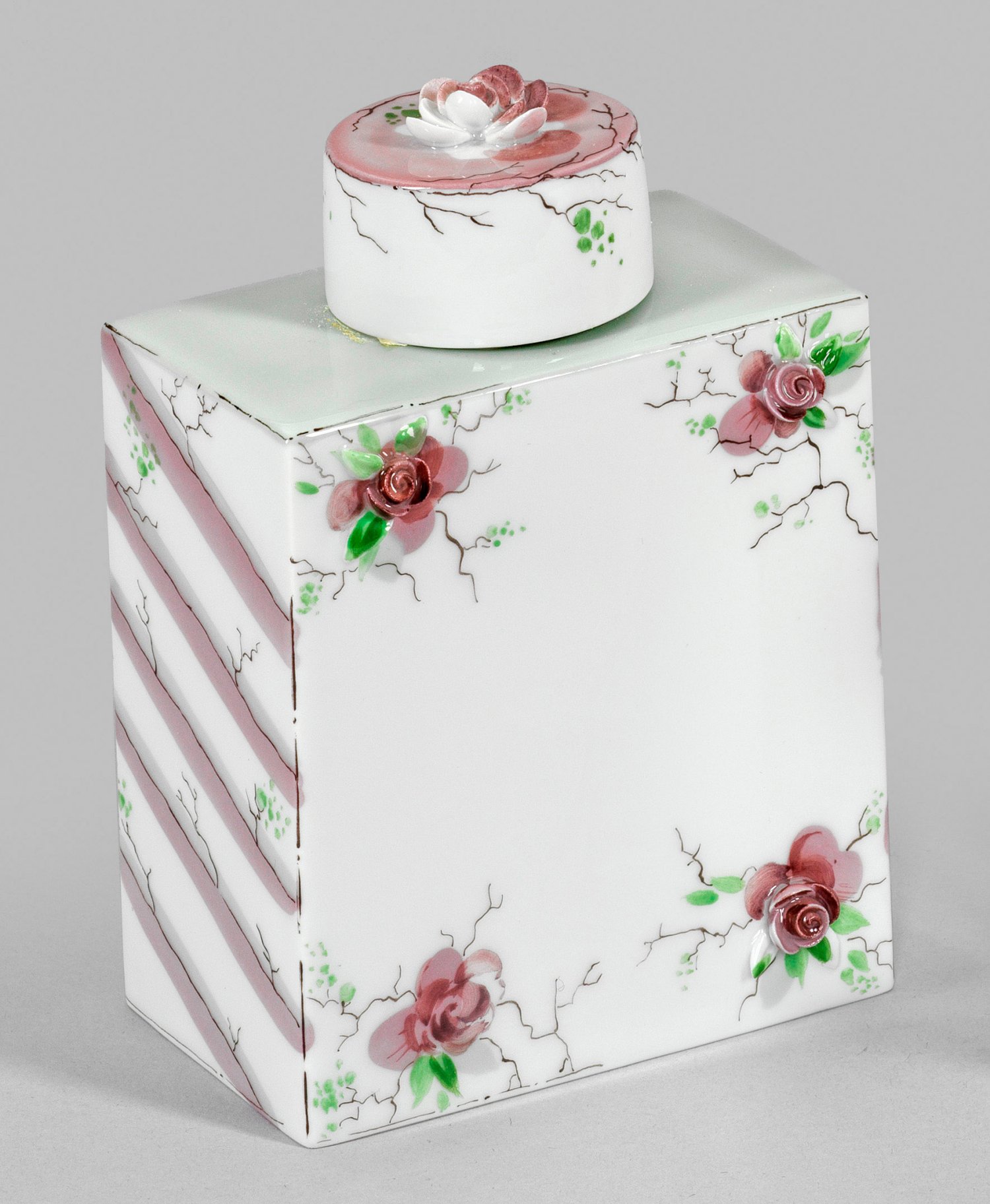 Hochrechteckiger, gerader Korpus mit flacher Schulter, kurzem Hals und übergreifendem Runddeckel mit reliefplastischem Knospenknauf. Schauseitig der Wandung in den Ecken reliefplastische Rosenblüten mit Blättern, gemalten Zweigen und Ästen. Verso korrespondierender gemalter Rosenblütendekor. Die Schmalseiten mit breiten Streifen und gemalten Ästen. Die Schulter mit seladonfarbenem Fond. Polychrome Lösungs- und Aufglasurmalerei. Entw. Sabine Wachs, 2005. Geritzte Serien-Nr. 21/2/2005. Zertifikat. Schwertermarke. H. 13 cm.