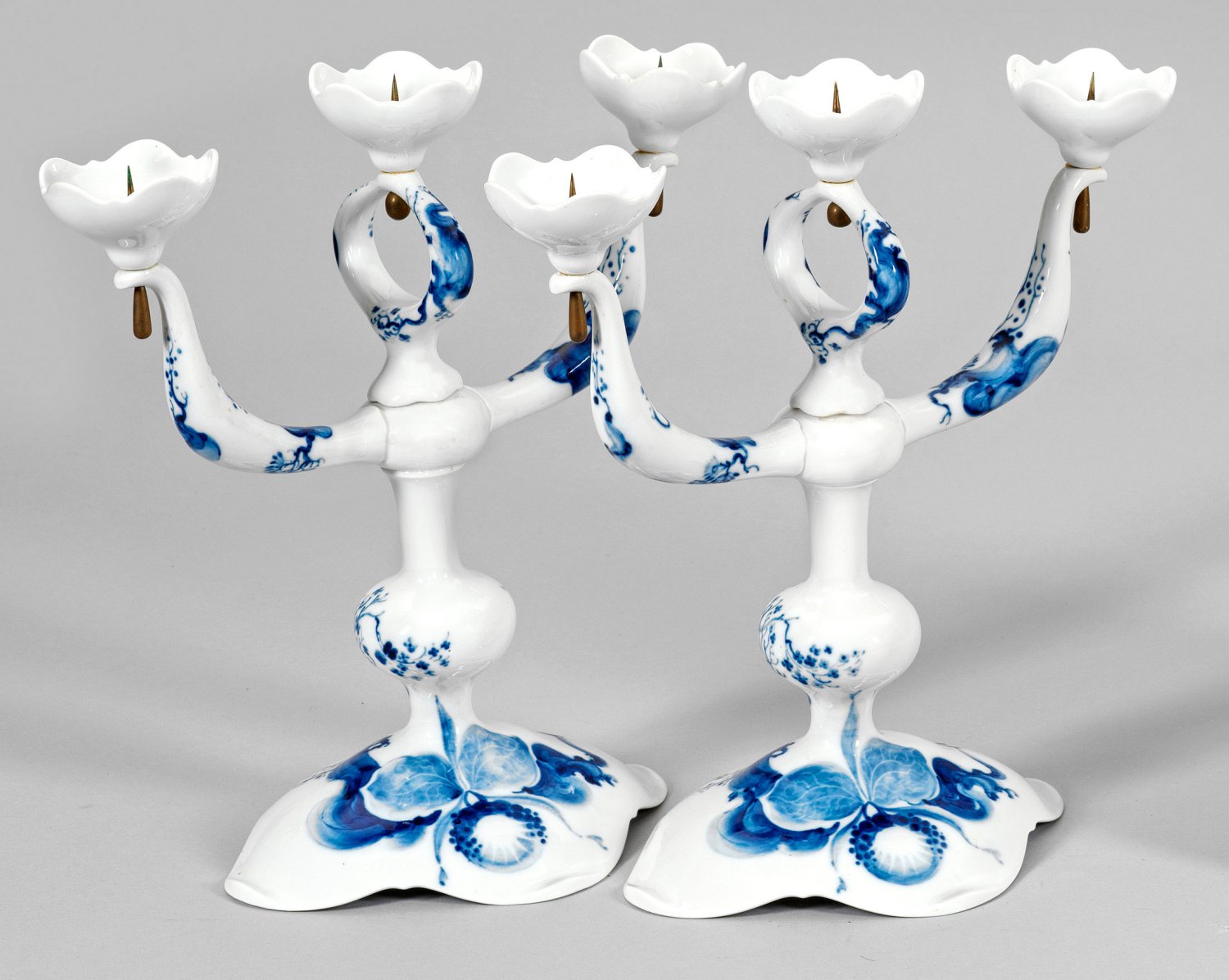 A pair of porcelain candelabras painted in underglaze blue with decor orchid on branch. Date mark. Crossed swords mark.
