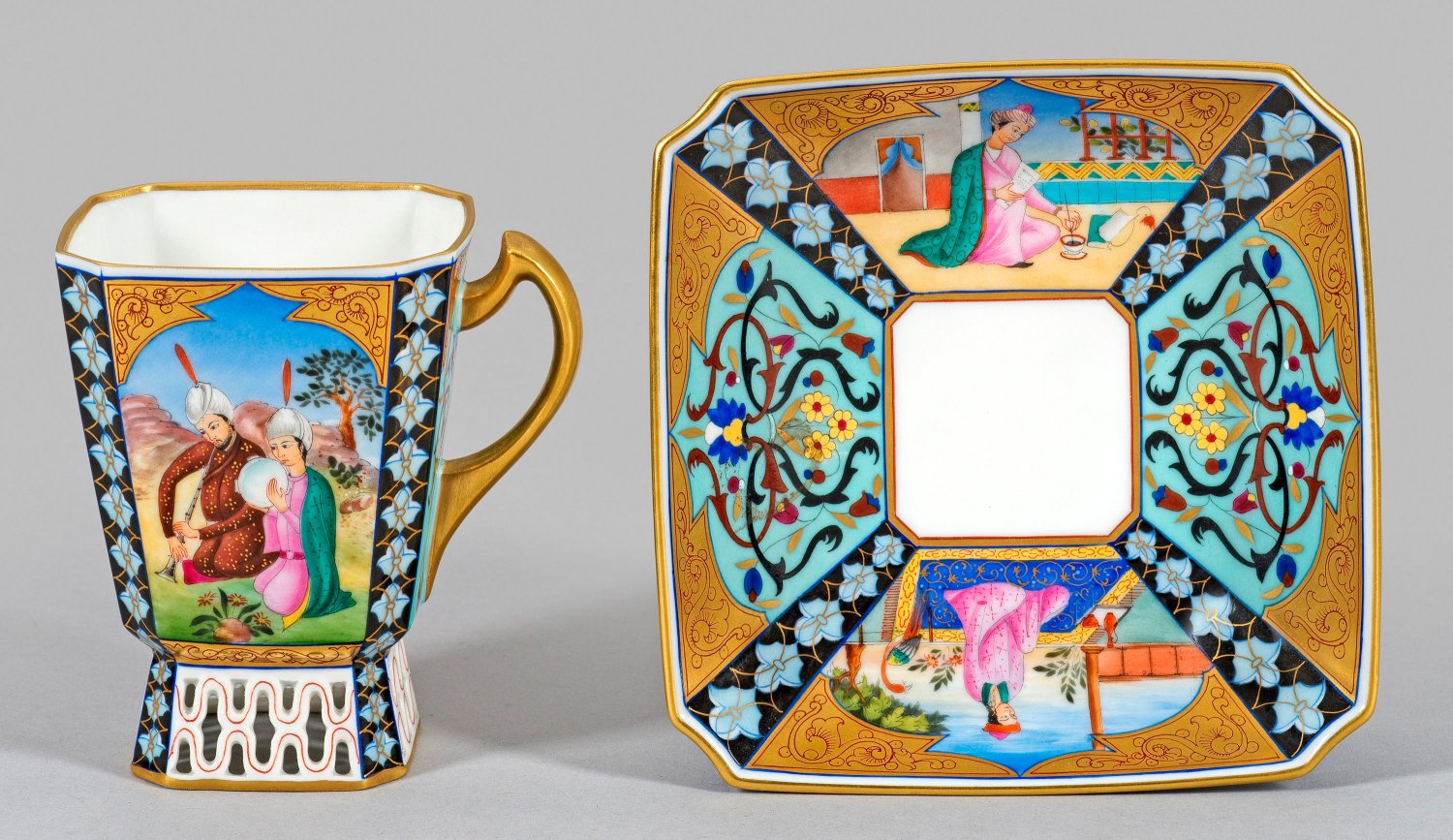 mit Untertasse. Trichterförmig sich erweiternde Form mit durchbrochen gearbeitetem Fuß. Beidseitig der Wandung bzw. im Spiegel exotische Gartenlandschaft mit Orientalen in traditionellen Gewändern, musizierend oder bei der Teezeremonie. Die flankierenden Seiten bzw. Ecken mit Ornamentbordüre auf türkisblauem Fond und Blütenstreifen auf kobaltblauem Grund. Feine polychrome Malerei mit reicher Goldstaffage. Manufakturmarke. Tassen-H. 8,3 cm. Untertassen-D. 10,5 cm