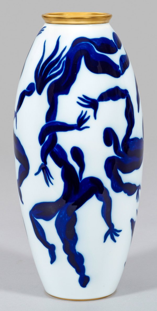 Gestreckt eiförmiger Korpus mit kurzem, schräg ansteigendem Rand. Umlaufend der Wandung abstrakt figurative Silhouetten in unterglasurblauer Malerei. Goldrand. Entw. Hervé van der Straeten. Entw.- und Dekor-Bez.; Manufakturmarke. H. 37,5 cm.