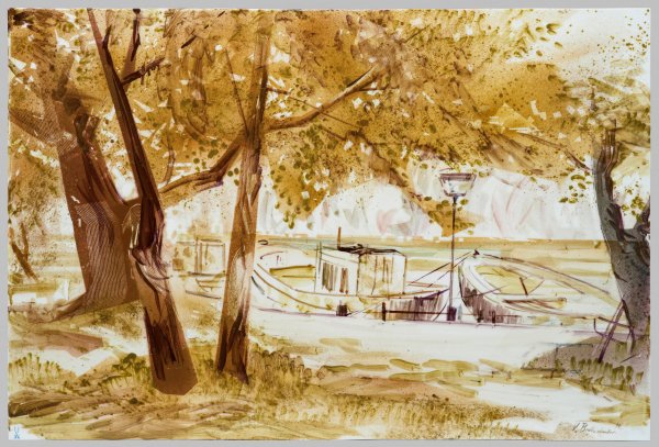 Rechteckige Platte auf Holz. Von einem beobachtenden Standpunkt aus die ausschnitthafte, baumbestandene Darstellung eines Hafens mit Fischkutter, Boot und Laterne. Überwiegend in unterschiedlichen Grün- und Erdentönen in lockerem Duktus gekonnt skizzierte Landschaft. Polychrome Aufglasurmalerei. Entw. und Ausführung der Malerei durch Volkmar Bretschneider, 1994. Künstler-Sign. "V. Bretschneider (19) 94." Unikat-Nr. 56/94. Unw. Risse. Schwertermarke. 76 cm x 51 cm.