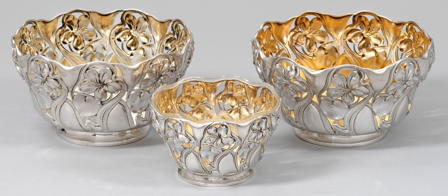 Silber und Glas. Runder, gering vertiefter Standring, übergehend in hohe, ornamental durchbrochene Wandung mit reliefplastisch getriebenem Dekor aus Irisblüten und -blättern, umgeben von fließenden Blütenstängeln. Innen teilw. vergoldet. Kleine Schale mit Glaseinsatz mit passig geschweiftem Rand und Schliffdekor. Minim. Gebrauchsspuren. Gest. 800, 333, Herstellerzeichen, teilw. Händlermarke Friedländer. Gew. ca. 1255 g (ohne Glaseinsatz). H. 8,5 cm - 12 cm. D. 14,5 cm - 21 cm.