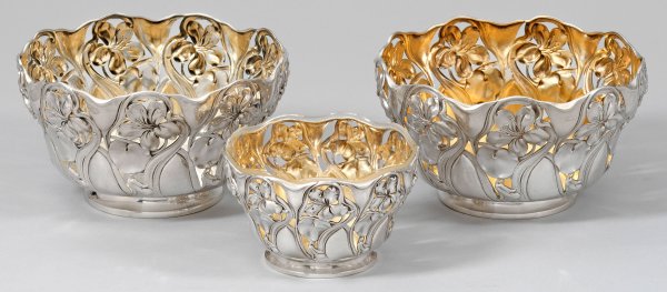 A set of three German Art Nouveau silver bowls, partly with glass insert. Partly gilt inside. Minor signs of use. Standard mark 800, 333, maker´s mark, partly dealer´s mark.