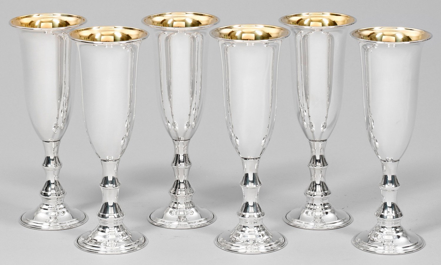 Six German Sterling silver champagne flutes. Gilt inside. Standard mark 925.