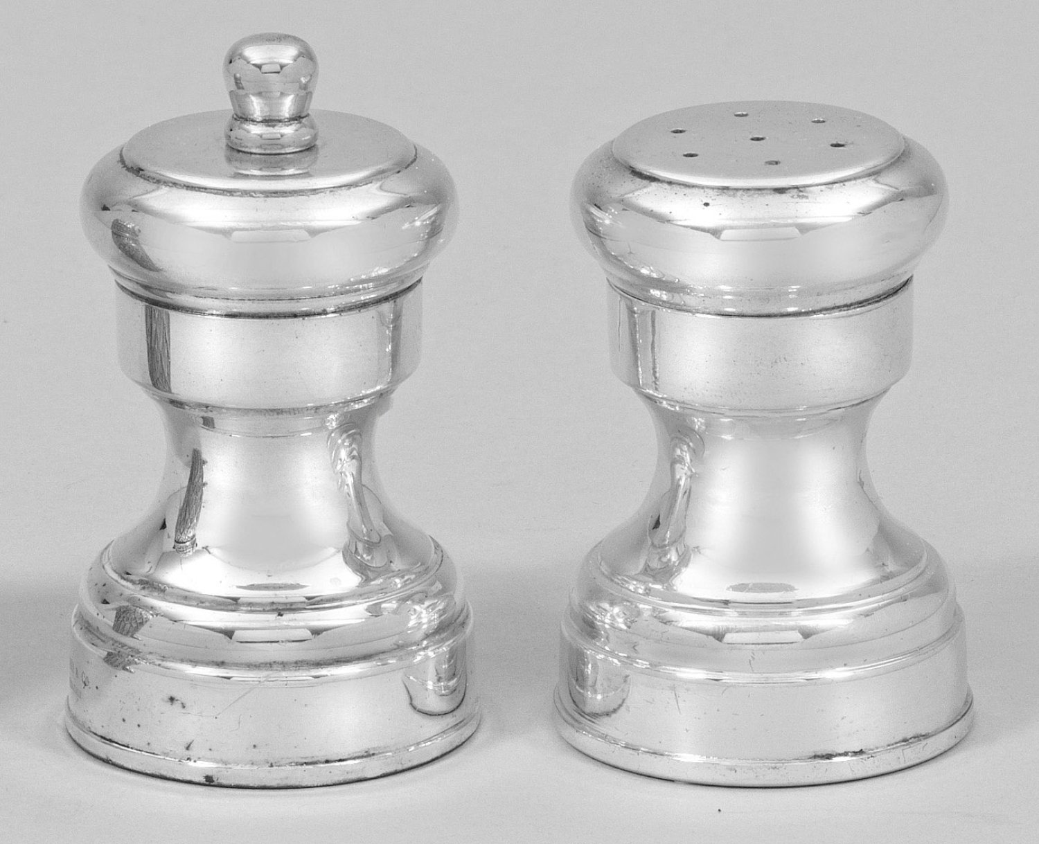 Sterlingsilber und Metall. Mehrfach profilierter, balusterförmiger Korpus. Minim. korrodiert. Gest. 925, Herstellerzeichen. Gew. zus. ca. 185 g. H. 6,5 cm - 7,5 cm.