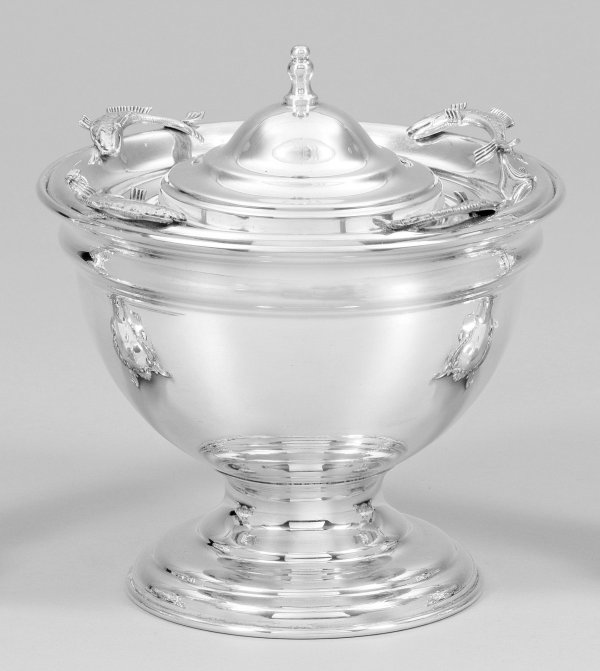 Sterlingsilber. Über getrepptem Rundstand halbrunder Korpus mit glatter Wandung. Einsatz mit vier plastisch gearbeiteten Fischen, mittig farblose Glasschale. Glockenförmiger Deckel mit Balusterknauf. Gest. 925. Gew. ohne Glaseinsatz ca. 665 g. H. 18 cm.