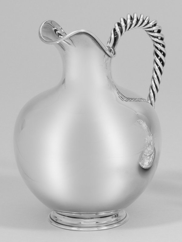 Sterlingsilber. Runder, gekehlter Stand, übergehend in stark gebauchten, glatten Korpus mit abgesetzter, gerundeter Schulter. Schmaler Lippenrand und ausgestellter, hochgezogener Ausguss. Aufsteigender spiralförmiger Henkel. Gest.925, Herstellerzeichen. Gew. ca. 545 g. H.19,5 cm.