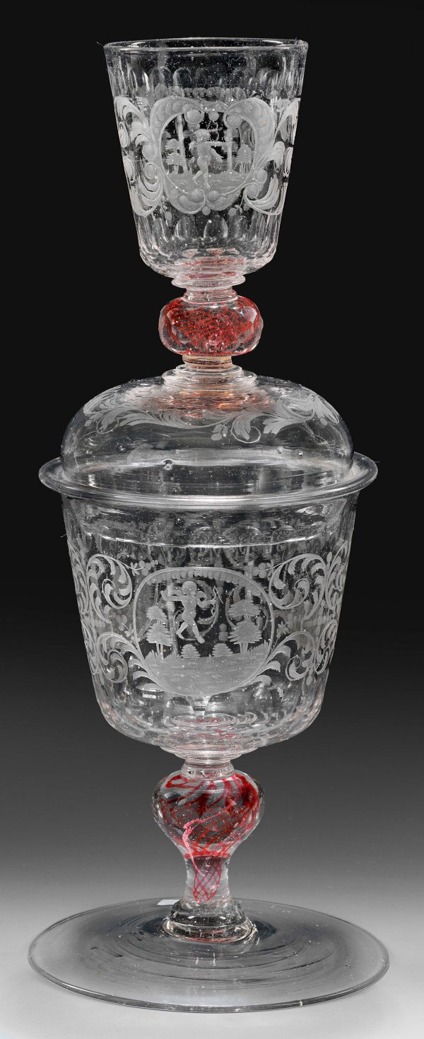 Farbloses Glas, geschliffen und mit Dekorschnitt versehen. Auf großem Tellerfuß niedriger Balusterschaft mit spiralförmig eingeschmolzenen roten Glasfäden. Auf der konischen, im Ansatz gerundeten Kuppa umlaufender Rankendekor und drei Bildmedaillons mit Amorettendarstellungen. Auf dem Deckelknauf aufgeschmolzen eine verkleinerte formgleiche und ähnlich dekorierter Pokalkuppa. H. 33,2 cm.