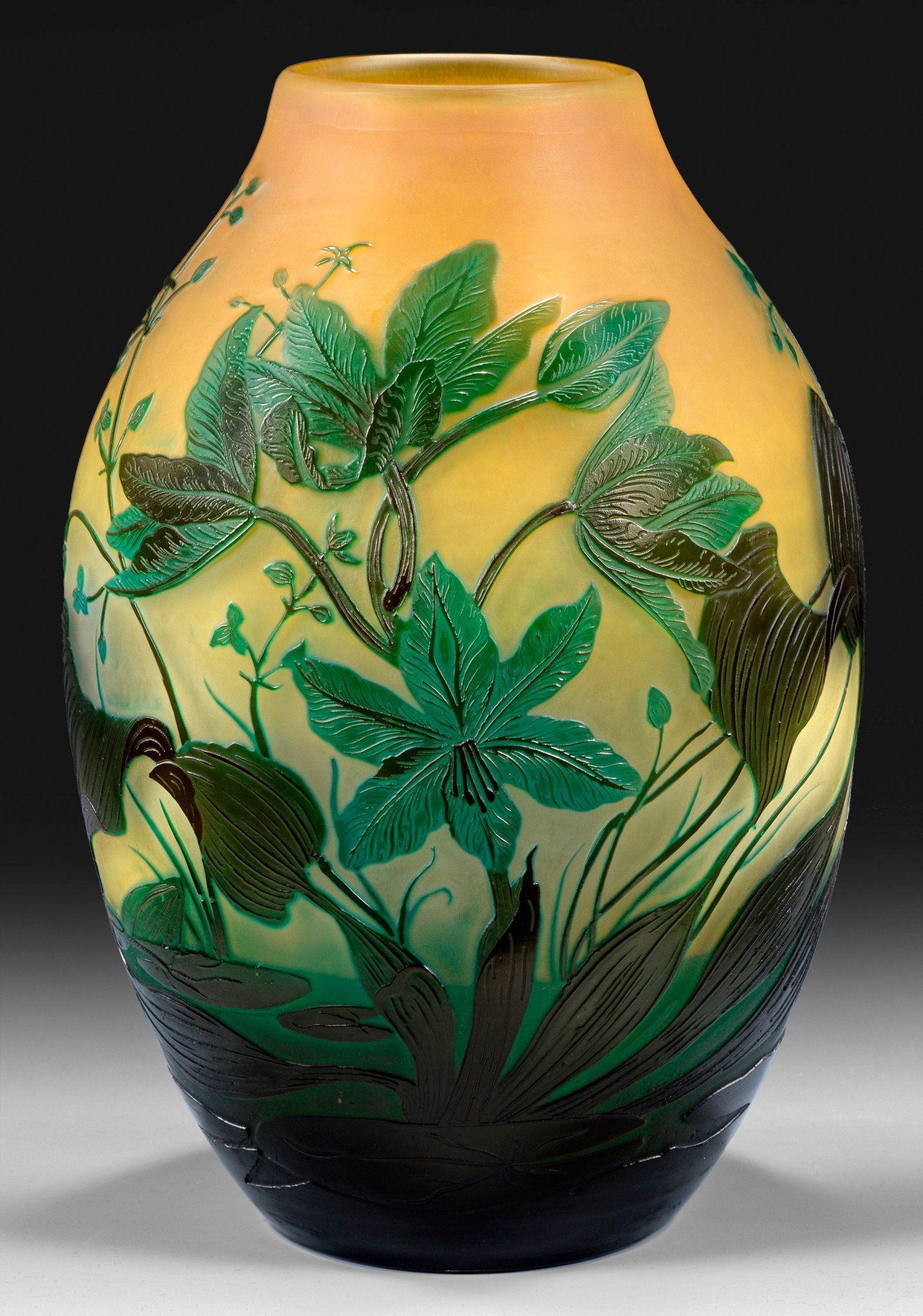Ovoider Korpus mit leicht eingezogener Mündung. Farbloses Glas, bernsteinfarben unterfangen, in einem mittleren Band weggeätzt. Blau und grünbraun überfangen. Geätzter reliefplastischer Dekor mit Teichlandschaft mit Pfeilkraut und Seerosen, in Hoch- und Tiefschnitt modelliert. Oberfläche matt, teilweise poliert. Sign. Gallé. H. 27 cm.