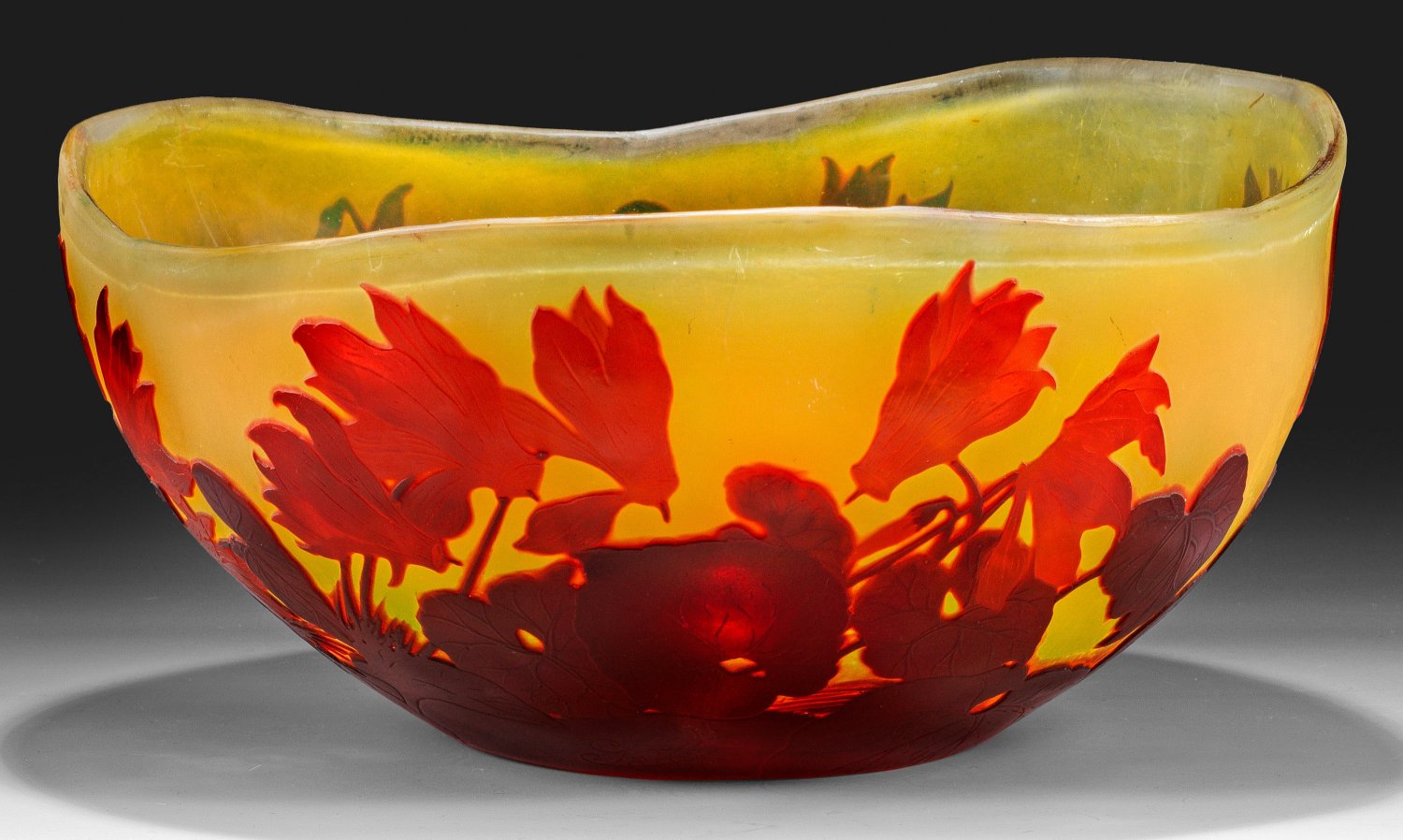 Dreipassige Schalenform. Farbloses Überfangglas, leicht milchig und gelb hinterfangen. In mehreren Arbeitsgängen geätzter, umlaufender, in Rottönen gehaltener Alpenveilchen-Dekor (Cyclamen). Sign. "Gallé". Schalen-D. ca. 25 cm. H. 12 cm.