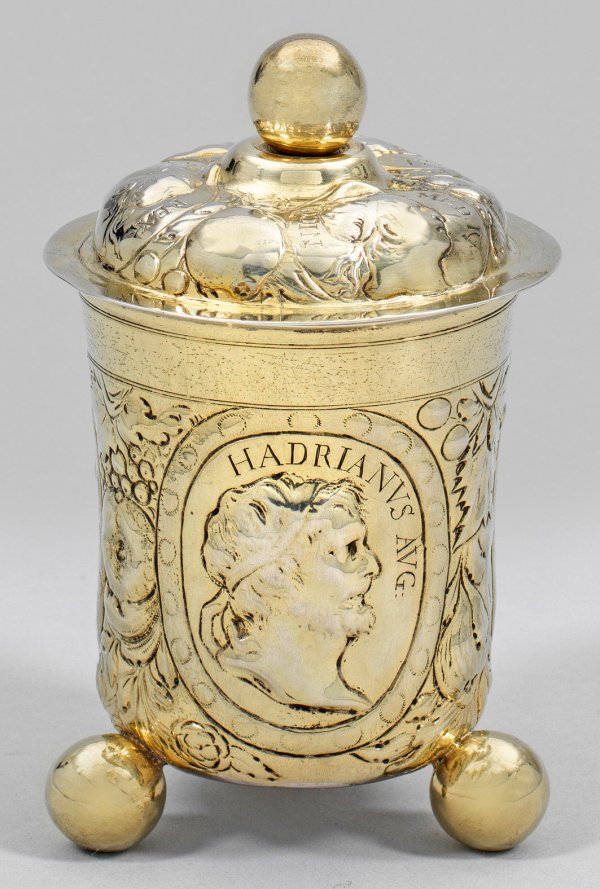 Silber, voll vergoldet. Von ausgestellten Kugelfüßen getragener, zylindrischer Korpus mit leicht ausschwingendem, glattem, von Profillinien gegliedertem Rand. Auf der Wandung und dem Deckel im Wechsel mit stilisierten, reliefplastischen Fruchtbündeln insgesamt sechs Medaillons mit charaktervoll getriebenen antikisierten Porträts römischer Herrscher, jeweils oberhalb graviert bez., u. a. Hadrian und Hieron. Haubenartiger Deckel mit abgesetzt glattem, weit ausgestelltem Rand und bekrönt von großem Kugelknauf. Gest., Tremolierstrich, Beschauzeichen, Hans Philipp Sigmund (wird Meister um 1659). Gew. ca. 205 g. H. 14 cm.