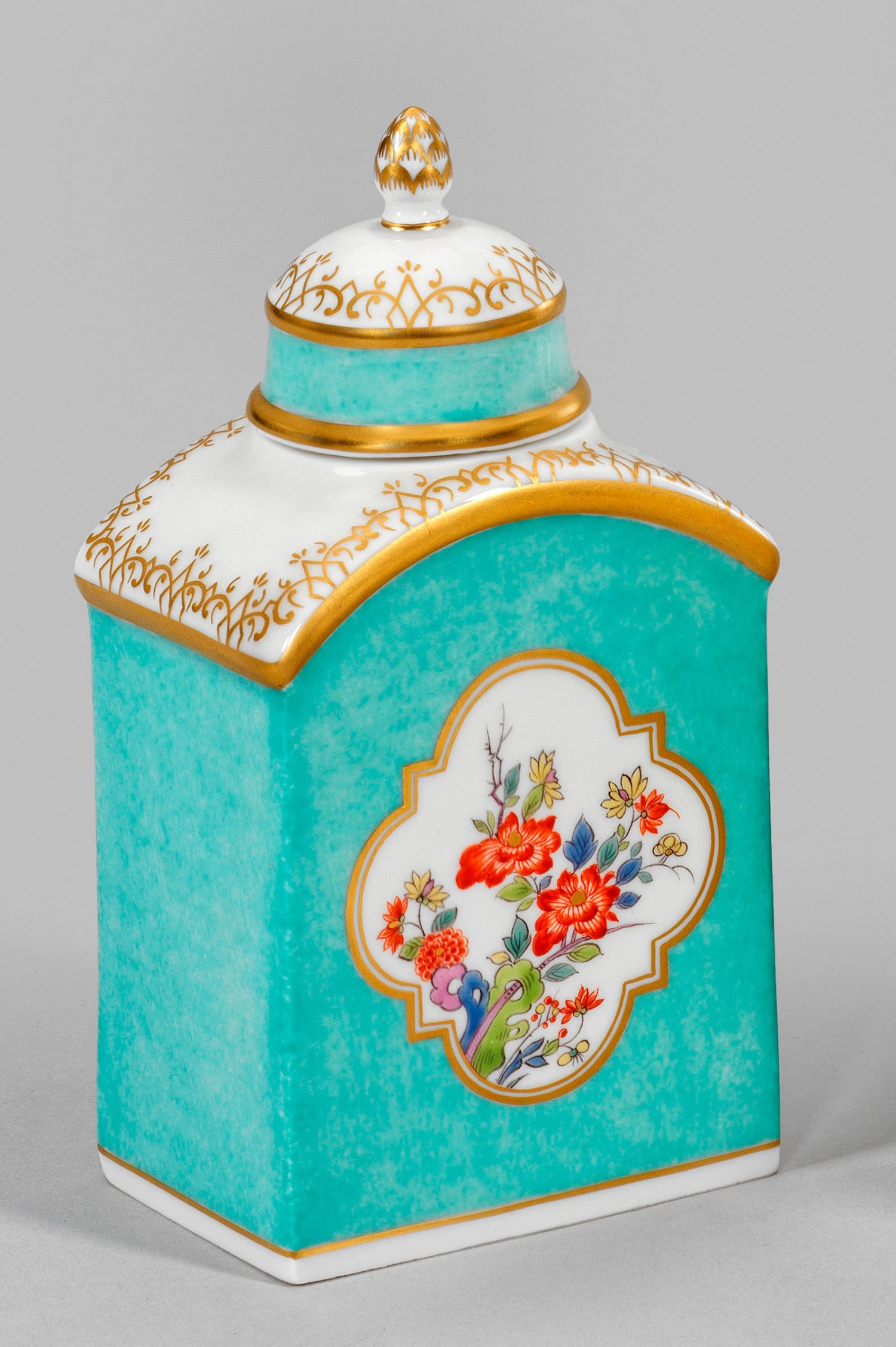 Lot 459: Teedose mit Kakiemondekor und seegrünem Fond