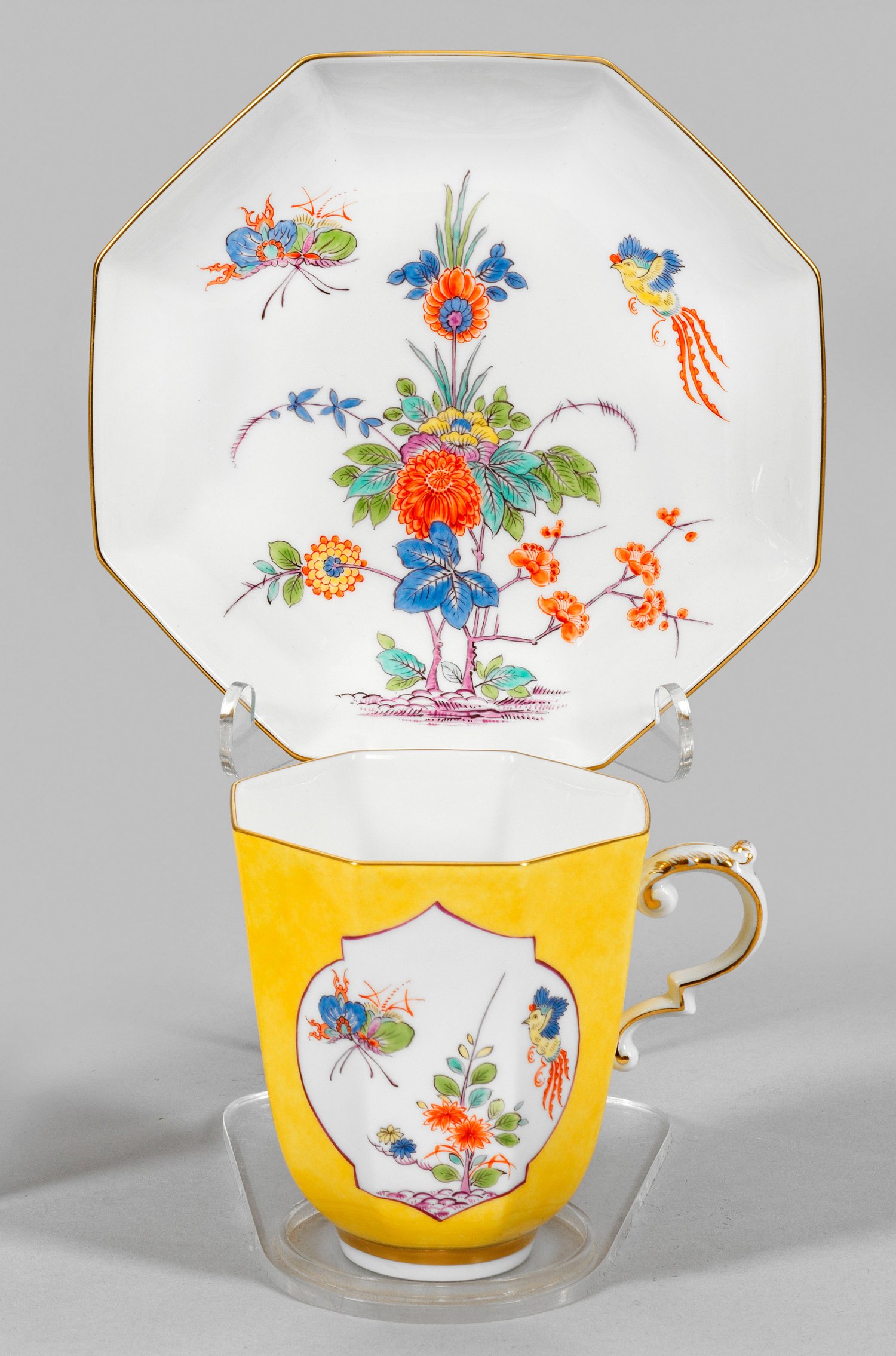 mit Unterschale. Oktagonale, kelchförmig gewölbte Form. Flächendeckender zitronengelber Fond auf der Tasse und rücks. der Untertasse. Beidseitig der Wandung von purpurner Vierpasskartusche gerahmter bzw. vollflächig im Spiegel arrangierter Kakiemondekor einer Blütenstaude mit fliegenden Schmetterlingen und Phönixen. Feine polychrome Malerei mit Goldrand. Aus der Edition "SinnBilder". Limitierung "04/75". Zertifikat. Schwertermarke. Tassen-H. 8,5 cm. Untertassen-D. 14 cm.