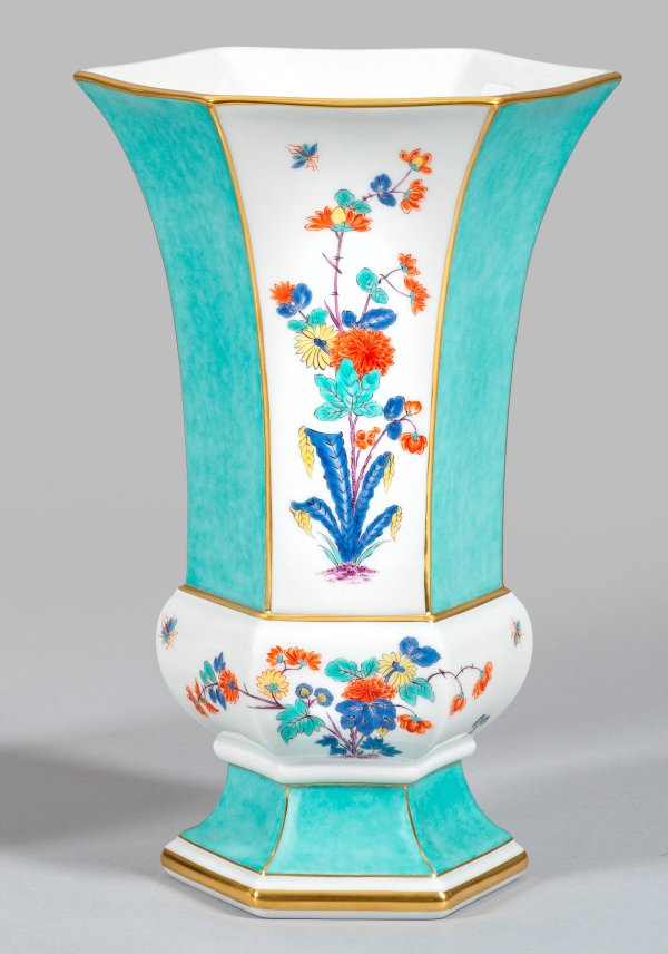 Sechskantig eingezogener, profilierter Fuß mit balusterförmig gewölbtem, in den passig gekanteten, trompetenförmig ausschwingenden Korpus übergehend. Allseits der Wandung alternierende, reiche Kakiemonmalerei aus weit verzweigten Chrysanthemen- und Päonienstauden bzw. seegrünem Fond. Feine polychrome Malerei mit Goldrand. Jahreszeichen. Schwertermarke. H. 27,5 cm.