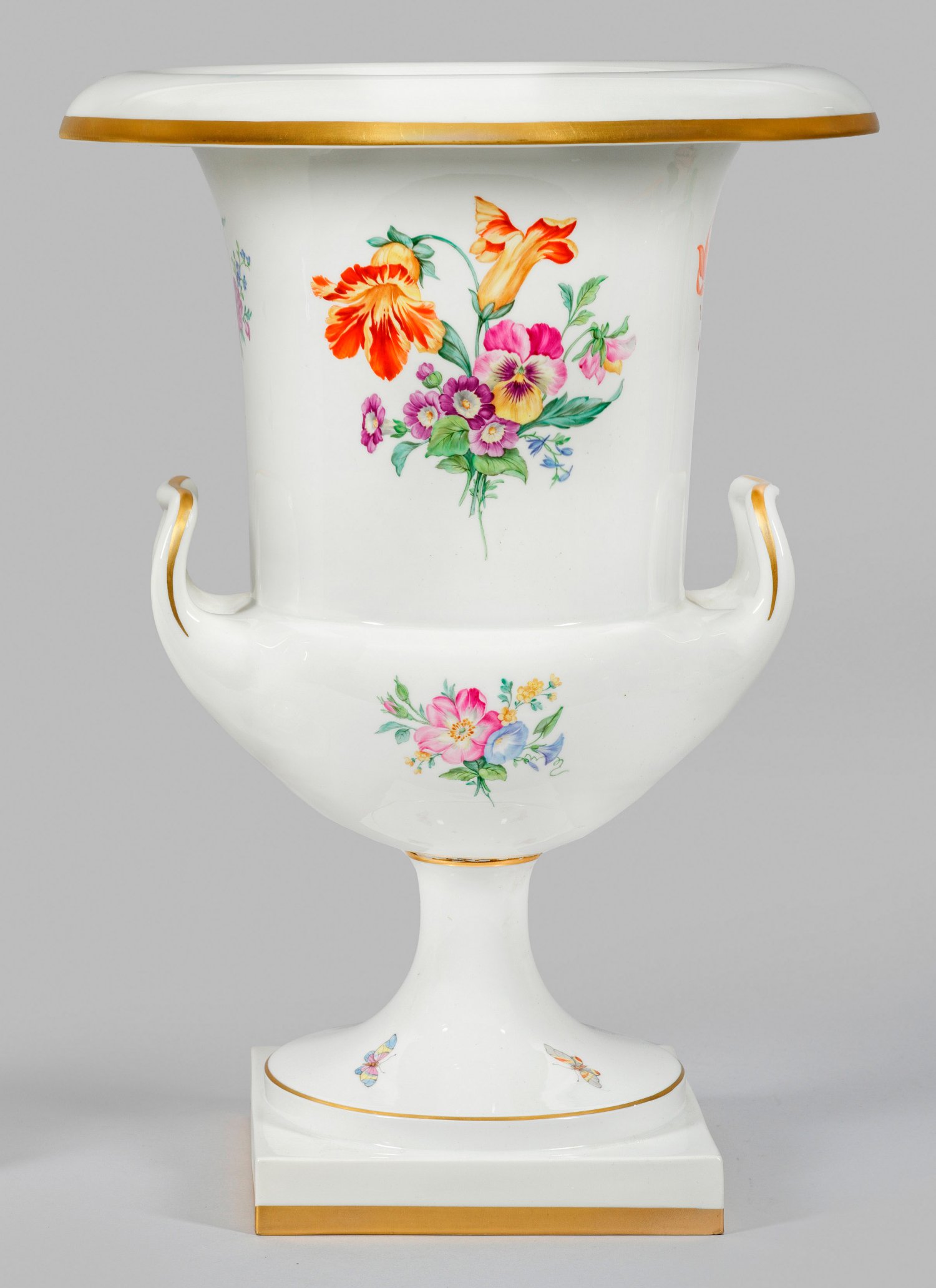 Sog. "Redensche Vase" oder "Medici-Vase". Hochgezogener Rundfuß auf quadratischer Plinthe. Gedrückt bauchiger Korpus mit abgesetztem, kelchförmigem Hals, in breiten, weit ausgestellten Rand übergehend. Seitlich ansetzende, gebogte Henkel. Bedseitig der Wandung kleine und große Blumengebinde und auf dem Fuß Schmetterlinge in polychromer Malerei mit Goldstaffage. Form-Entw. Johann Carl Friedrich Riese. Vergoldung äußerst minim. rest.; Zepter- und Malereimarke. H. 42,5 cm.