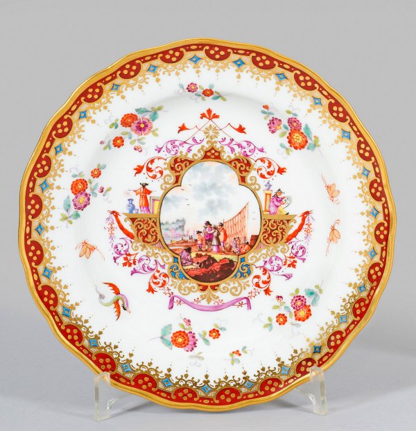 Rund, leicht vertiefte Form mit passig geschweiftem Rand. Im Spiegel goldornamentierte, von Laub- und Bandelwerk gerahmte Vierpassreserve mit Hafenszene. Beidseitig auf den Konsolen sitzende Chinesen mit Schrifttafel und Stab, das Steigbord mit Indianischem Blumendekor. Breite, Goldornamentbordüre mit siegelrotem Fond auf der Fahne. Rückseitig des Standrings roter Doppelring und Goldband. Polychrome Malerei im Stil Höroldts mit reicher Goldstaffage. Vergolder-Nr. 24. Schwertermarke. D. 24,5 cm.