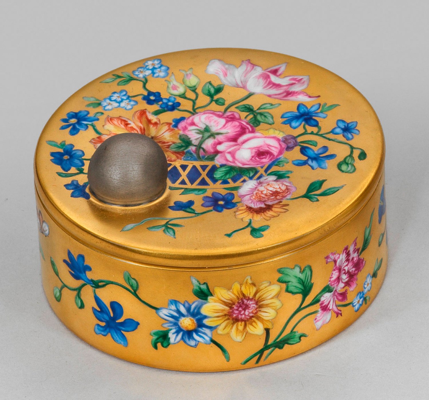 Flache Rundform. Auf dem voll vergoldeten Fond umlaufend der Wandung und auf dem Deckel, aus einem Korb vollflächig sich ausbreitende Blumen, darunter Rosen, Winden, Margeriten in feiner polychromer Malerei. Reliefplastische, aus Biskuitporzellan gefertigte Kugel mit Platinauflage auf dem Deckel. Limitierung "3/10". Zertifikat. Zepter- und Malereimarke. H. 4,5 cm. D. 8 cm.