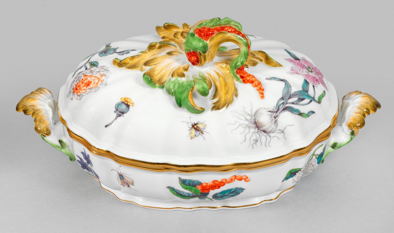 Oval gedrückte, durch Grate gegliederte Form mit seitlichen, vegetabilen Griffen. Passig aufgewölbter Deckel mit der Bekrönung in Gestalt einer plastisch gearbeiteten Pfefferschote. Umlaufend der Wandung und auf dem Deckel sog. "trockene Blumenmalerei mit Früchten" in Anlehnung an die Holzschnittblumen. Feine poylchrome Malerei mit Goldstaffage. Entw. nach Johann Joachim Kaendler. Aus der limitierten Serie "SinnBilder". Limitierung 04/50. Zertifikat. Schwertermarke mit Goldsignet. L. 19,5 cm. H. 10,5 cm.