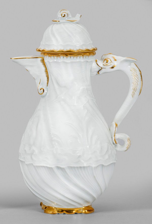 Birnförmiger Korpus mit aufgewölbtem Deckel, mittig plastischer Knauf in Gestalt einer Schnecke. Figürlicher Henkel als Delfin. Auf der Wandung feiner muschelförmiger Reliefdekor (Schwanendessin) aus zwei einander zugeneigten Schwänen, fliegendem und zwischen hohem Schilf stehendem Reiher. Gekämmte Goldkante und -staffage. Entw. nach Johann Joachim Kaendler und Johann Friedrich Eberlein. Schwertermarke. H. 26 cm.
