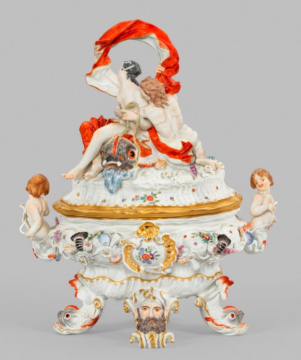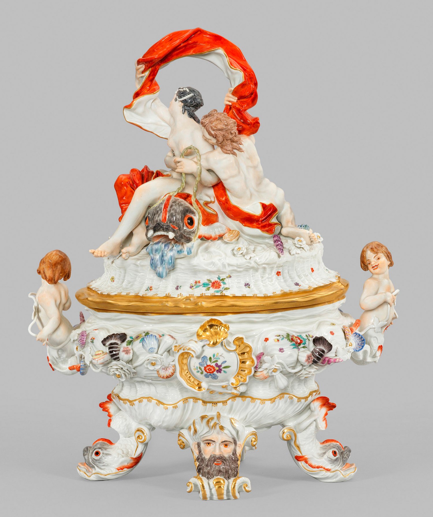 Ovale Terrine auf vier Füßen, an den Schmalseiten als Delphine, an den Längsseiten als Masken von Flussgöttern ausgebildet. Der üppig reliefierte Korpus belegt mit plastischen Muscheln, Schnecken und Korallen, an den Längsseiten muschelförmige Kartuschen, mit Blüten bemalt. Die seitlichen Handhaben in Form von Nymphen mit Fischschwänzen. Der Muschelprofil-Deckel mit Muscheln, Schnecken und Blüten belegt. Als Bekrönung eine vollplastische Figurengruppe, die Nymphe Galatea auf einem Delphin darstellend, die von ihrem Liebhaber Acis begleitet wird. Beide sind teilw. von einem roten Gewand umhüllt, das sie gemeinsam zu einer Bogenform emporwerfen, welche als Handhabe des Deckels fungiert. Polychrome Malerei mit Gold. Entw. Johann Joachim Kaendler. Modell-Nr. 05028. Jahreszeichen. Minim. rest.; Schwertermarke. H. 45 cm. B. 35 cm.