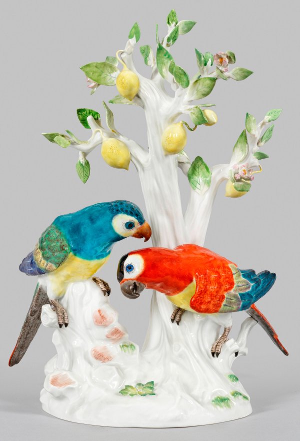 Auf ovalem Natursockel auf einem Felsvorsprung bzw. an einem Zitronenbaum sitzende, dem Gegenüber zugetane Papageien mit farbenprächtigem Gefieder. Reich mit plastischen Blättern, Blüten und Zitronen besetzter Baum. Polychrome Malerei. Entw. Johann Joachim Kaendler. Modell-Nr. 644. Jahreszeichen. Partiell rest.; Schwertermarke. H. 39,5 cm.