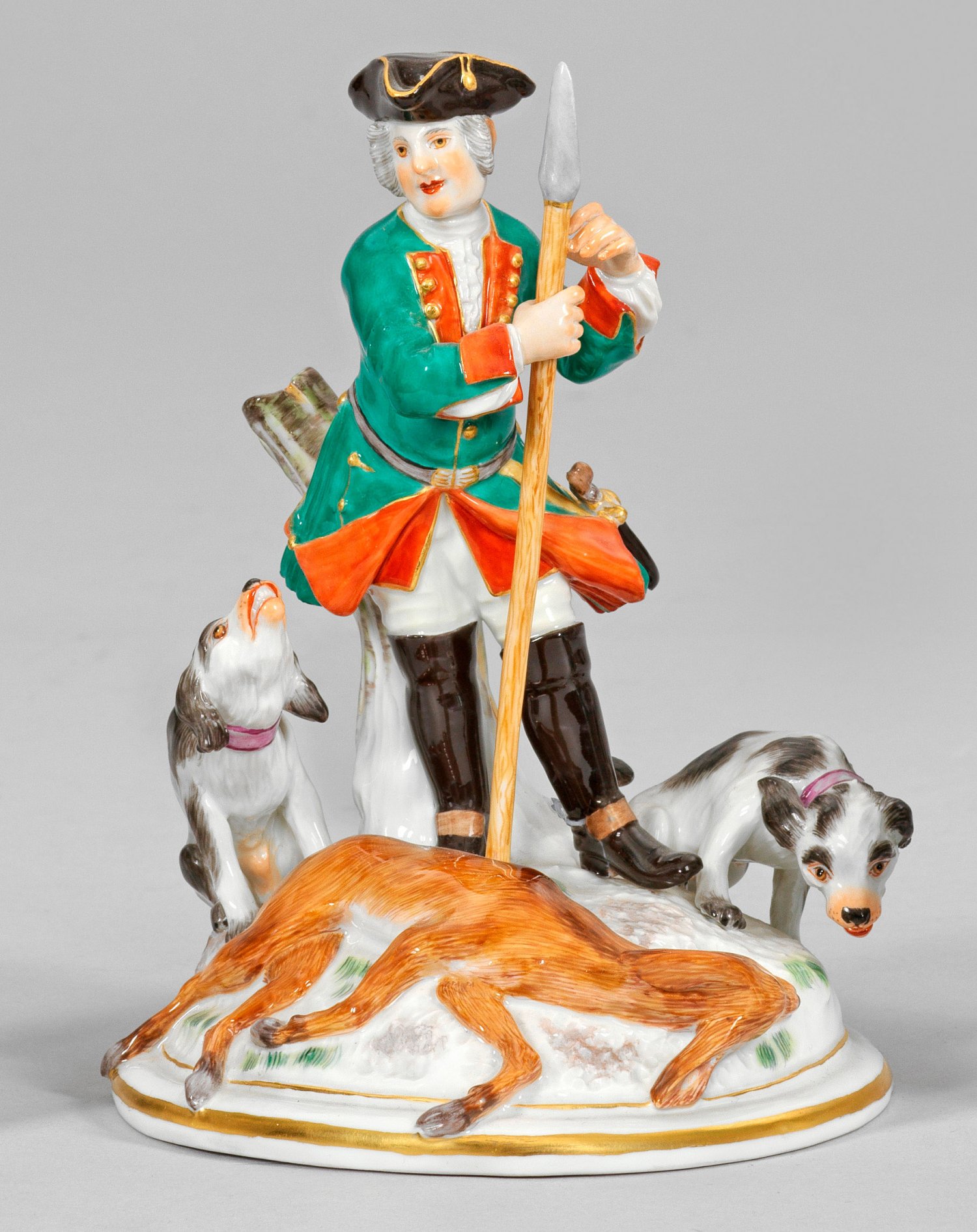 Auf gewölbtem Sockel stehender Jäger in grünem, rot abgesetztem Jagdrock mit Dreispitz, umgeben von zwei Hunden, in der rechten Hand einen Speer haltend. Zu den Füßen liegendes, erlegtes Reh. Polychrome Malerei mit Goldstaffage. Entw. Johann Gottlieb Ehder. Modell-Nr. 63007. Schwertermarke. H. 16 cm.