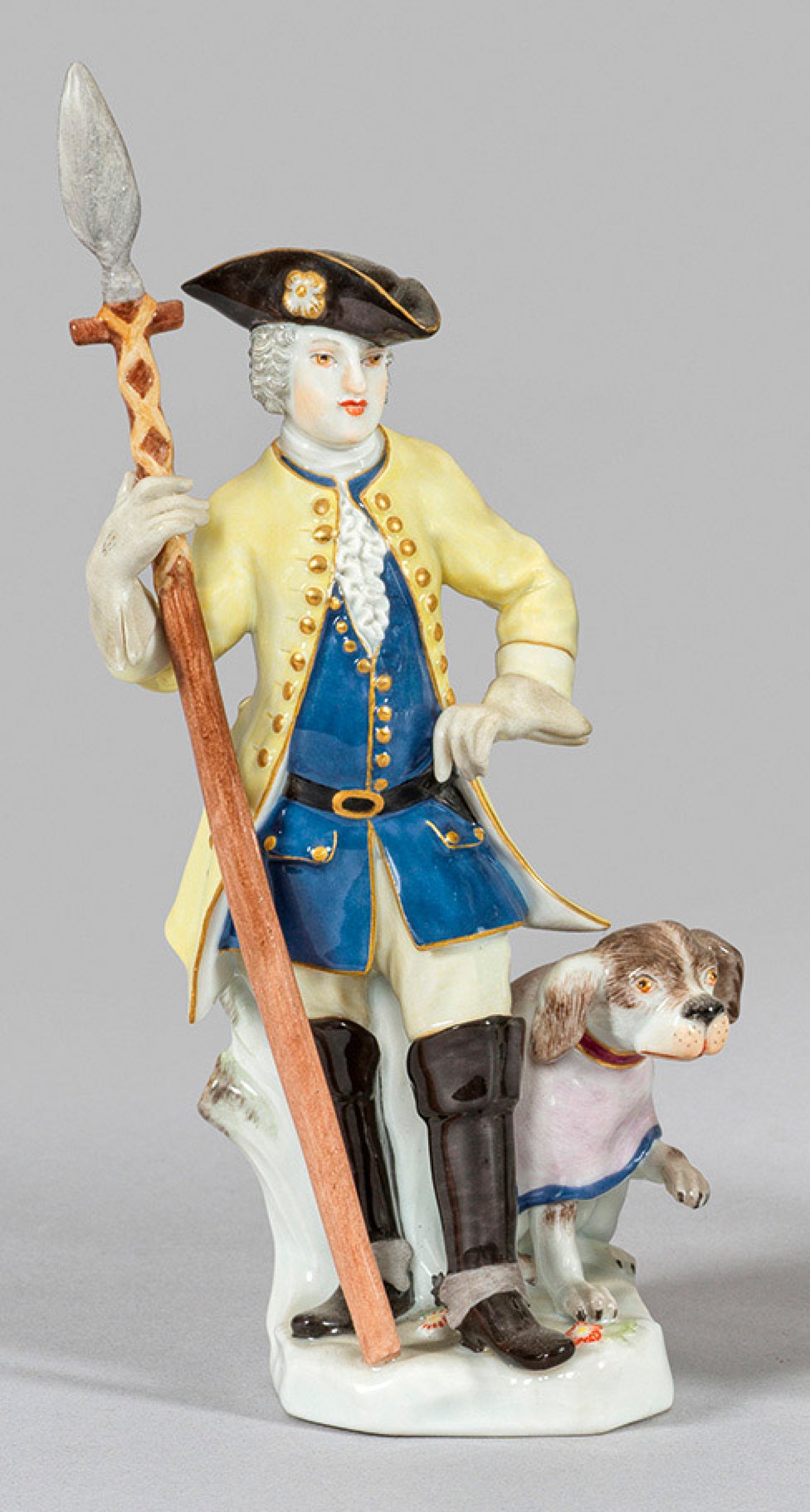 Auf naturalistisch gestaltetem Sockel stehender Jäger mit Sauspieß in gelber Jacke über blauer Weste. Zu seinen Füßen sitzender Jagdhund. Polychrome Malerei mit Goldstaffage. Entw. Johann Gottlieb Ehder. Modell-Nr. 63016. Schwertermarke. H. 17 cm.
