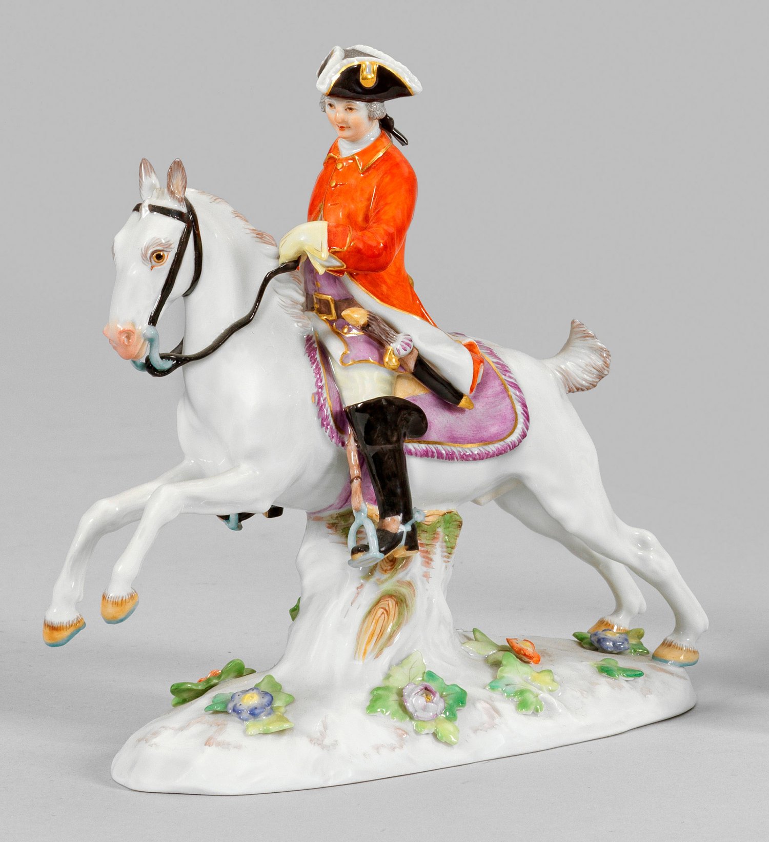 Ovaler, von plastischen Blüten und Blättern belegter Sockel. Zu Pferd sitzender Kavalier, in der linken Hand die Zügel, in der Rechten eine Gerte haltend. Polychrome Malerei mit Goldstaffage. Entw. Johann Joachim Kaendler. Modell-Nr. 69539. Minim. best.; Schwertermarke. H. 14,5 cm.