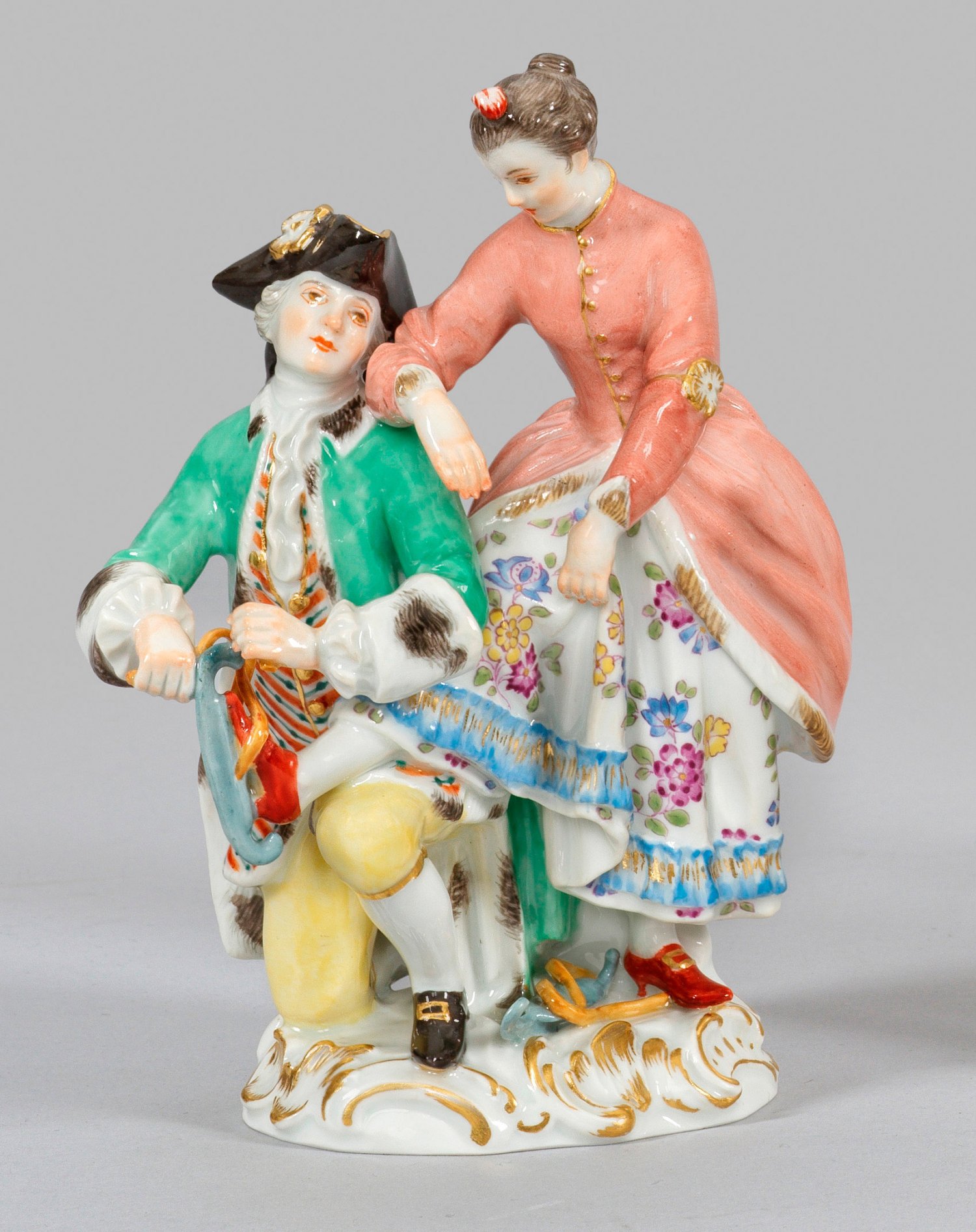 aus der Serie der "Vier Jahreszeiten". Auf rocaillereliefiertem Sockel kniender Kavalier, einer Dame die Schlittschuhe anschnallend. Polychrome Malerei mit Goldstaffage. Entw. Johann Joachim Kaendler. Modell-Nr. 36. Minim. rest.; Schwertermarke. H. 14,5 cm.