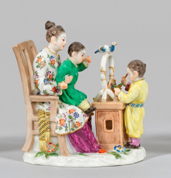 Auf einem ovalen, mit Blüten belegten Sockel auf einem Stuhl sitzender Japaner, ein Kind auf seinem Schoss sitzend, das stehende Kind eine Vogelvoliere beobachtend. Polychrome Malerei mit dezenter Goldstaffage. Entw. Johann Joachim Kaendler und Peter Reinicke. Modell-Nr. 2472. Schwertermarke. H. 13 cm.