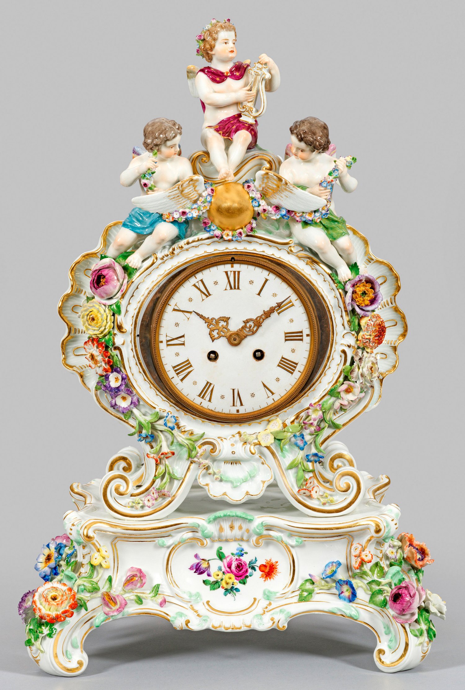 fest auf Sockel. Geschweifter, von vier eingerollten Rocaillefüßen mit plastisch aufgelegten Blumenbuketts getragener, rechteckiger Sockel mit Streublümchen und Insekten. Zentrale Kartusche mit Blumenarrangement. Über vier eingerollten Volutenfüßen balusterförmig aufsteigender, teilw. muschelförmig reliefierter Uhrenkorpus. Schauseitig kartuschenartig gerahmtes und reich von plastisch aufgelegten Blütenranken umzogenes Zifferblatt mit arabischen Zahlen. Darauf zwei seitlich sitzende Amoretten mit Blütengirlanden, den vergoldeten Flügel umspannend. Bekrönt von bekränztem Amor mit Lyra als Apoll, Gott der Musik, Dichtkunst und des Gesangs. Polychrome Malerei mit Goldstaffage. Modell-Nr. 161. Werk mit Glocke. Unw. rest./best.; Schwertermarke. Ges.-H. 53,5 cm.