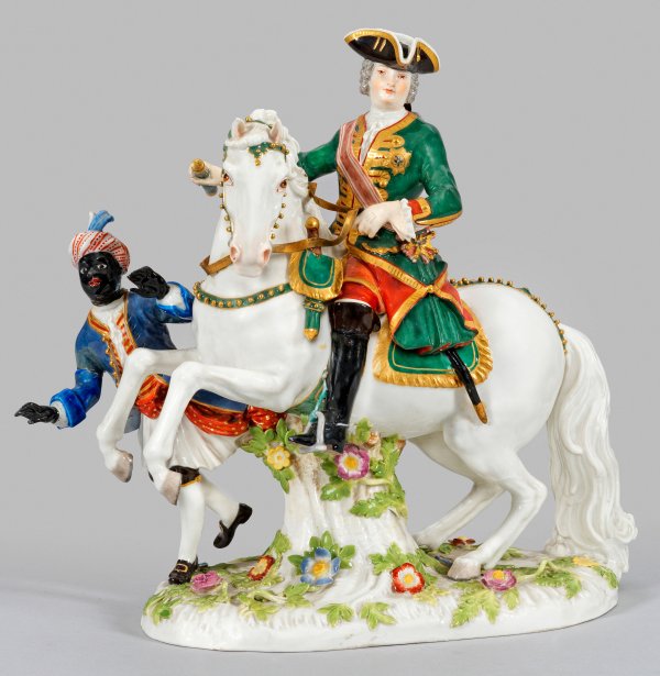 Ovaler, mit plastischen Blütenranken belegter Sockel. Auf einem Schimmel im Herrensitz reitende Zarin in Uniform eines Obersten des Preobraschenski-Garderegiments mit Großkreuz des Andreas-Ordens. An ihrer Seite ein Page mit Turban. Polychrome Malerei mit reicher, teilw. radierter Goldstaffage. Entw. Johann Joachim Kaendler. Modell-Nr. 1059. Minim. Rest.; Schwertermarke. H. 23,5 cm.