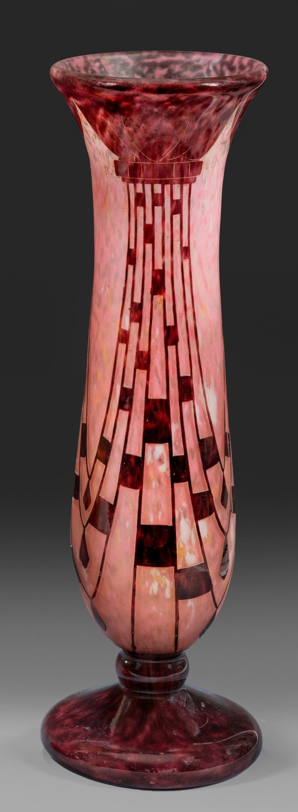 Langgestreckte Keulenform mit Fuß. Gelb-weiß-rosafarben gesprenkeltes Glas. Überfang mit violetter Pulverein- bzw. -aufschmelzungen. Geätzter "Collier"-Dekor mit oben abschließender Dekoration, an eine Vorhang-Draperie erinnernd. Entw. Charles Schneider. Ätz-Sign. "Le Verre Français" sowie "Charder". H. 47,5 cm.