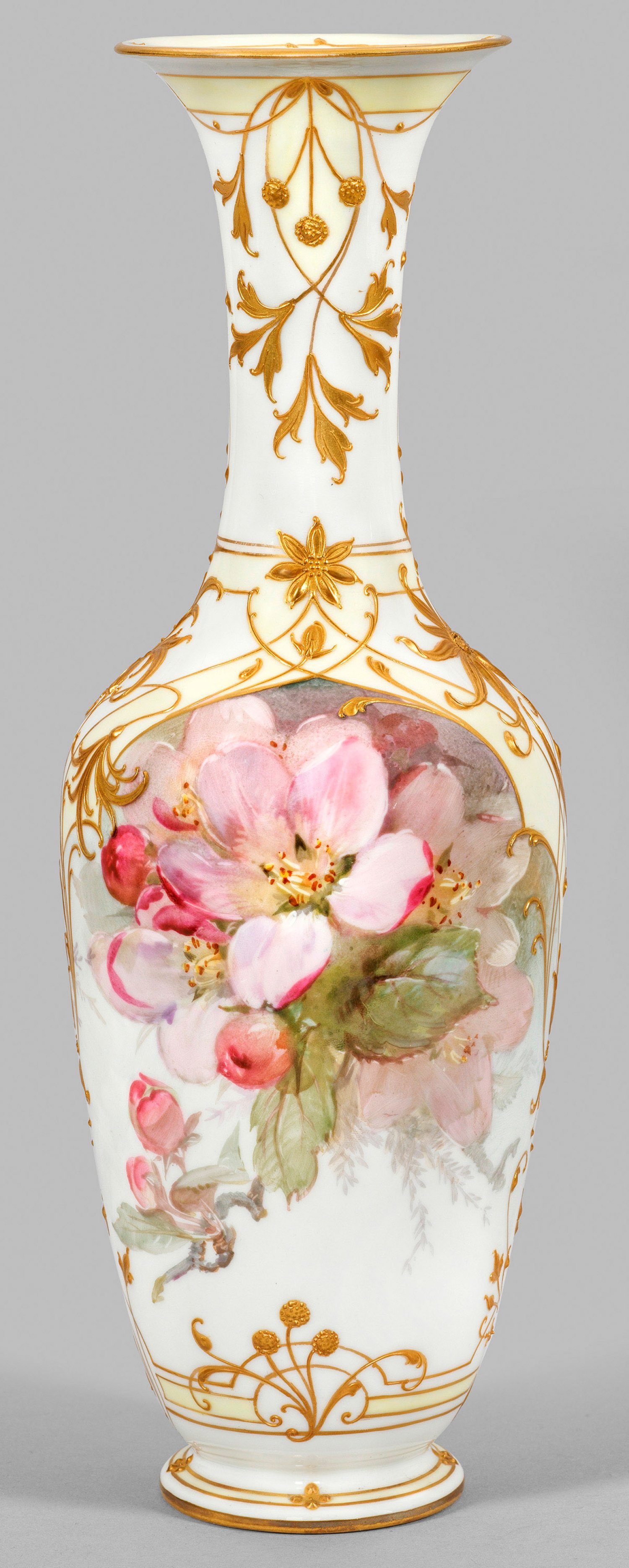Auf gering gewölbtem Rundfuß flaschenförmiger, gestreckt-ovoider Korpus mit gerundeter Schulter, in eingezogenen Hals und weit ausschwingenden Mündungsrand übergehend. Beidseitig der Wandung blühende und knospende Zweige der Heckenrose vor diffus verlaufendem Fond in pastelltoniger Weichmalerei. Umlaufend reicher Reliefgolddekor mit zartgelbem Teilfond aus feinlinigen, stilisierten Blüten- und Rankenornamenten. Form-Entw. der sog. "Glatten Blumenflasche", KPM-Werkstatt um 1880. Malerzeichen in Rot für Blumenmaler Max Liebenau und in Hellbraun für Blumenmaler Johann Bergmann (geb. 1878; KPM mit kurzer Pause von 1892 - 1927) bzw. Dekormalerzeichen in Gold für Willi Schäfer (geb. 1867; KPM von 1891 - 1929). Undeutl. Jahreszeichen. Unw. rest.; Zepter- und Malereimarke. H. 26,5 cm.