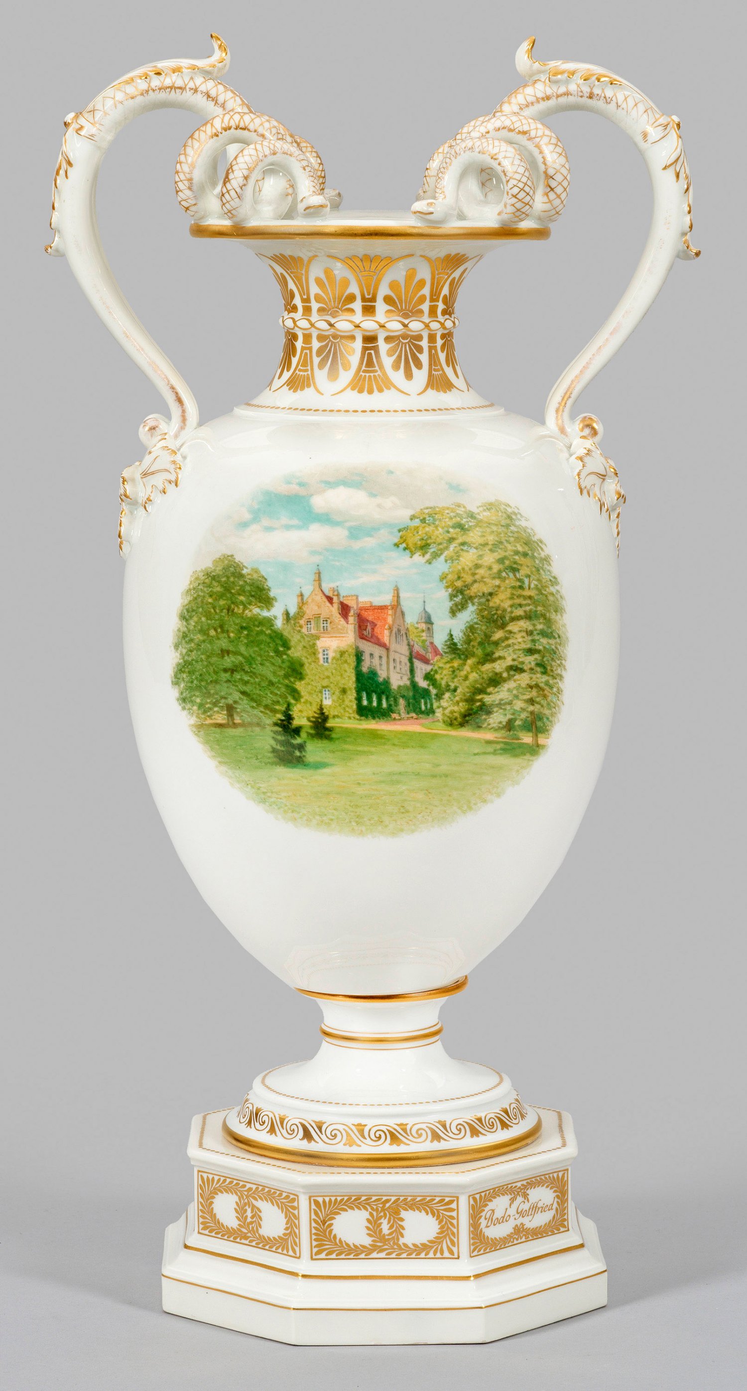 sog. Urbino-Vase. Über oktogonalem, getrepptem Postament mit rundem Fuß, ovoider Korpus mit gerundeter Schulter, in eingezogenen Hals und weit ausschwingenden Rand übergehend. Seitlich, über aufgelegtem Blattreliefansatz, geschweift aufsteigende Handhaben in Gestalt eines, sich spiralförmig windenden Schlangenpaares. Beidseitig zentral der Wandung oval dargestellte Besitzungen der Familie von der Marwitz. In der weiten Parkanlage eingebettet das Anwesen Schloss Friedersdorf bzw. das Gut Groß Kreutz. Am Sockelrand vergoldete Lorbeerkränze mit den Namen der ehem. Eigentümer "Bodo Gottfried" (von der Marwitz; 1893 - 1982) und "Bernhard" (von der Marwitz; 1824 - 1880). Feine polychrome Malerei mit Goldstaffage. Form-Entw. Julius Wilhelm Mantel. Rest.; Zepter-, Malerei- und Gedächtnismarke (Eisernes Kreuz). H. 47 cm.