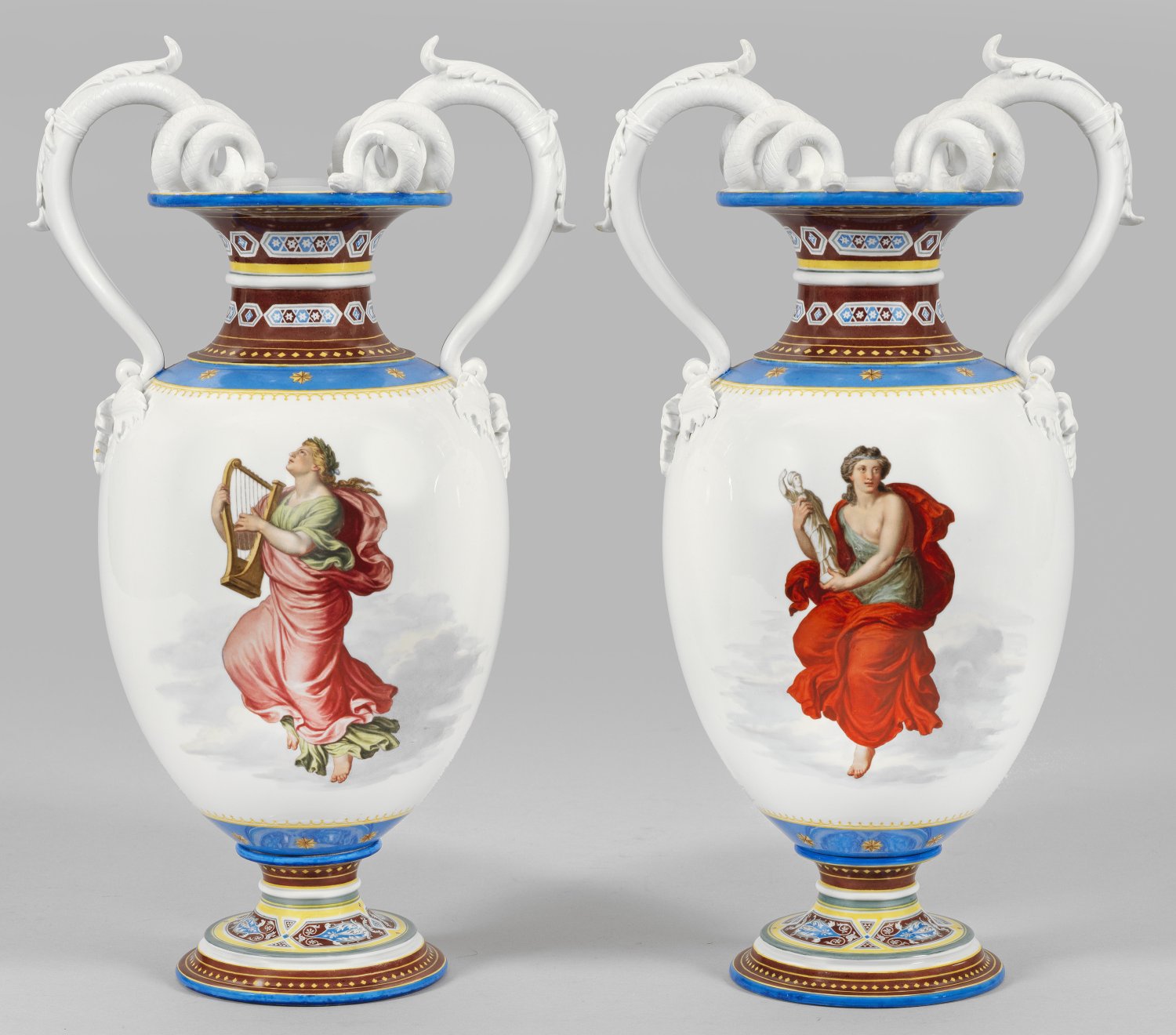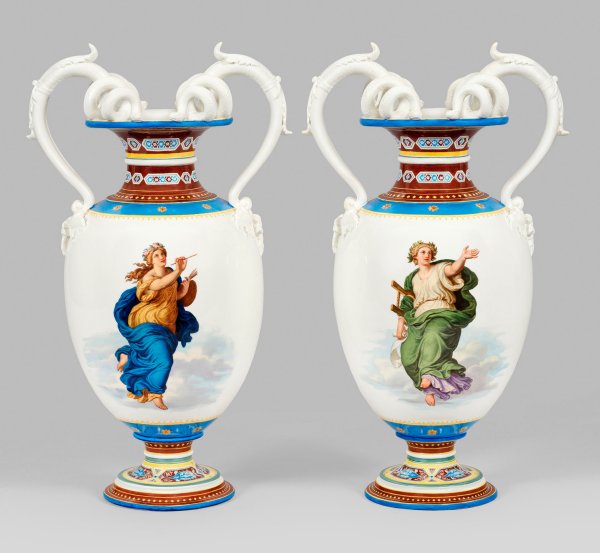 Auf oktogonalem, getrepptem Sockel mit hochgezogenem Rundfuß ovoid ansteigender Korpus mit gekehltem Hals und weit ausschwingendem Rand. Beidseitig geschweifte, aus Blattreliefs aufsteigende Handhaben in Gestalt eines sich spiralförmig windenden Schlangenpaares aus Biskuitporzellan. Beidseitig zentral der Wandung wohl die Darstellung vier schwebender Musen bzw. Allegorien der Malerei, Bildhauerei und Dichtkunst. Im Zentrum junge, weibliche Personifikation in antikisierender Kleidung, eine Palette und Pinsel haltend bzw. verso mit Saiteninstrument und Lorbeerkranz. Auf dem Gegenstück eine junge Dame mit antiker Skulptur und die lorbeerbekränzte Darstellung mit Schriftrolle und Saiteninstrument. Feine polychrome Malerei mit floralen und sternförmigen Ornamenten auf verschiedenfarbigen Teilfonds auf Fuß und Schulter. Form-Entw. Julius Mantel. Modell Urbino. Minim. rest.; Malereimarke. H. 42 cm - 42,5 cm.
