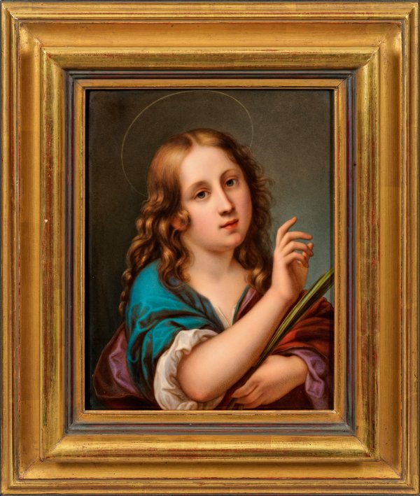 Rechteckige Platte. Brustbildnis der jungen Heiligen Agnes von Rom mit langer Lockenpracht und Märtyrerpalme vor grau verlaufendem Fond. Feine polychrome Malerei. Nach einem Ölgemälde von Carlo Dolci (1616 - 1686), Bayerische Staatsgemäldesammlungen, Alte Pinakothek München (Inv.-Nr. 281). Geprägte Zepter- und KPM-Marke. Vergoldeter Holzrahmen. Plattenmaß 28 cm x 23 cm. Rahmen 42 cm x 37 cm.