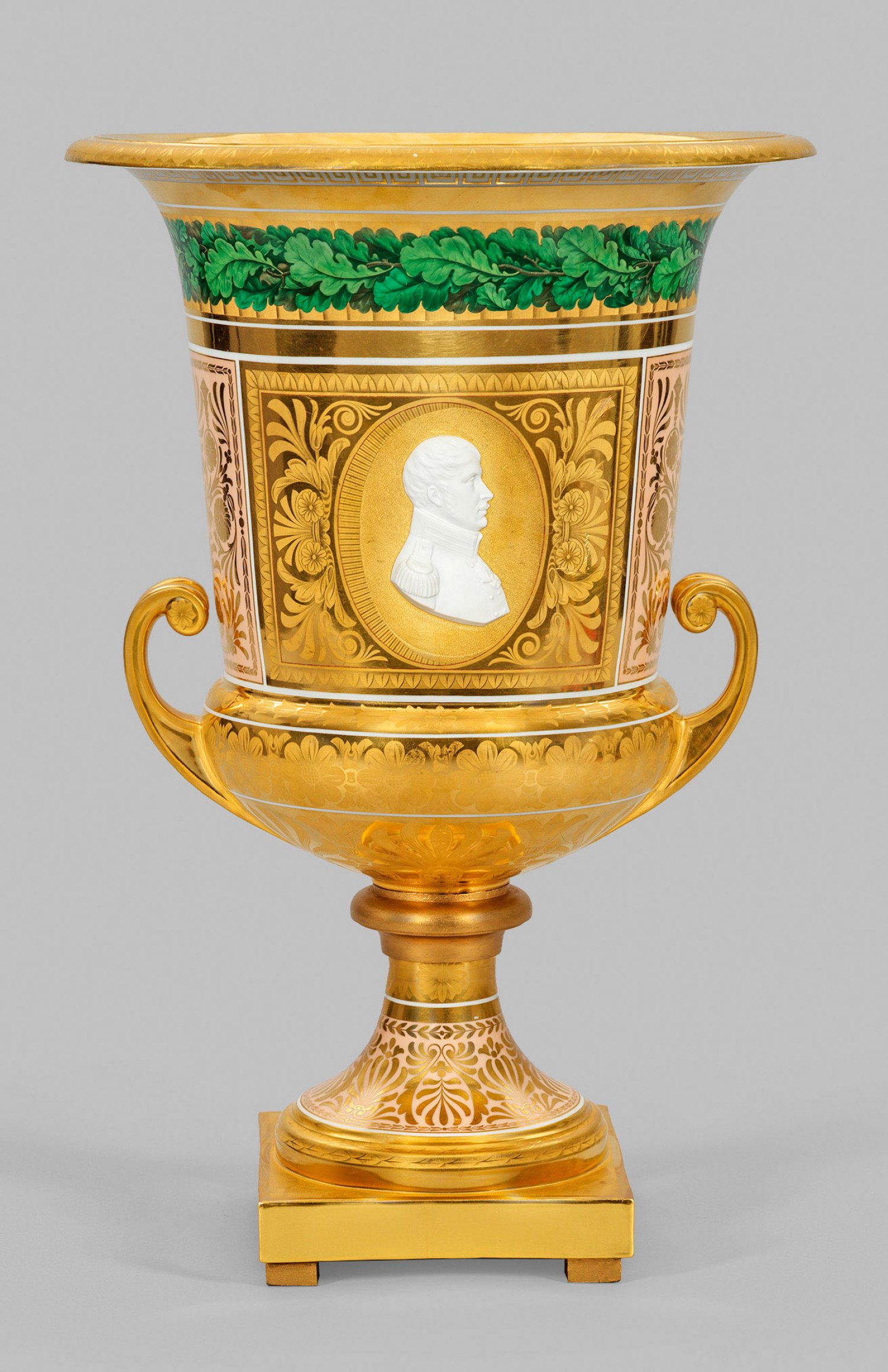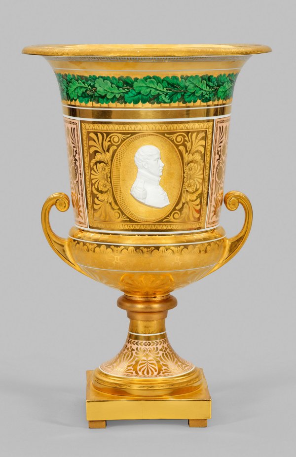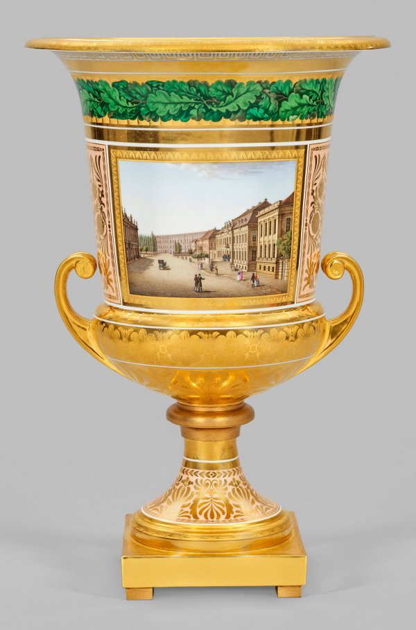 sog. „Vase mit gekrümmten Henkeln.“ Hochgezogener Rundfuß auf quadratischer Plinthe. Gedrückt bauchiger Korpus mit abgesetztem, kelchförmigem Hals, in weit ausschwingenden Rand übergehend. Seitlich ansetzende, gebogte Spiralbandhenkel. Schauseitig zentral der Wandung eine goldradierte Rechtecksreserve mit Berlin-Ansicht der vielfigurig belebten Prachtstraße „Unter den Linden“ mit Blick auf Zeughaus, Schloss sowie rechtslagig Kronprinzen- und Prinzessinenpalais. Verso in korrespondierender Kartusche im Oval das nach rechts gewandte, reliefplastische Profilbildnis von König Friedrich Wilhelm III. aus Biskuitporzellan nach Leonhard Posch auf fein radiertem Vermicellifond. Allseits reiche, flächendeckende, vielfach fein radierte, florale- und ornamentale Vergoldungen, auf den Schmalseiten und Fuß mit lachsfarbenem Fond. Oberhalb auf fächerartig radiertem Grund eine umlaufende Eichenlaubbordüre mit abschließendem Mäanderband. Die Öffnung oberhalb mit verschiedenen Vergoldungen und floraler Radierung sowie radiertem Vermicellifond. Äußerst feine polychrome Malerei. Form-Entw. Karl Friedrich Schinkel. Unw. rest.; Zepter- und Malereimarke. H. 53,5 cm.