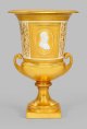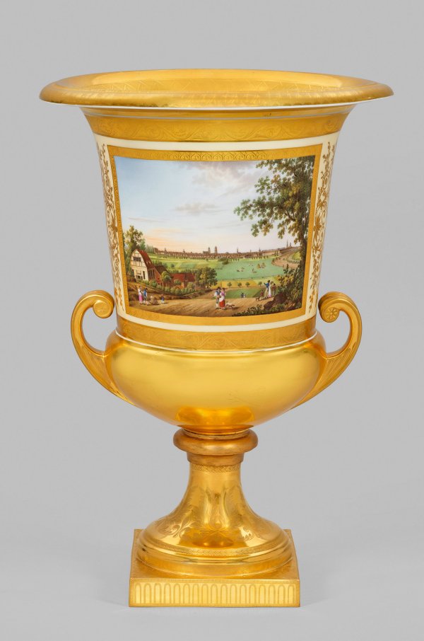 sog. "Vase mit gekrümmten Henkeln." Hochgezogener Rundfuß auf quadratischer Plinthe. Gedrückt bauchiger Korpus mit abgesetztem, kelchförmigem Hals, in weit ausschwingenden Rand übergehend. Seitlich ansetzende, gebogte Spiralbandhenkel. Schauseitig zentral der Wandung eine goldradierte Rechtecksreserve mit der bez. "Aussicht vom Kreuzberge nach Berlin". Von einem erhöhten Standpunkt aus und dem später entwickelten Stadtteil Kreuzberg liegt zur linken, baumbestandenen Seite ein kleines Gutshaus mit Blick auf weite Felder und die in sichtbarer Ferne liegende Stadt Berlin. Verso in korrespondierender Kartusche im Oval das nach rechts gewandte, reliefplastische Profilbildnis von König Friedrich Wilhelm III. aus Biskuitporzellan nach Leonhard Posch auf fein radiertem Vermicellifond. Allseits reiche, flächendeckende, vielfach fein radierte, florale- und ornamentale Vergoldungen, auf den Schmalseiten und Fuß mit zartgelbem Fond. Die Öffnung oberhalb mit verschiedenen Vergoldungen und floraler Radierungen und breitem Goldband. Äußerst feine polychrome Malerei von Johann Eusebius Anton Forst. Maler-Sign. "J. Forst". Form-Entw. Karl Friedrich Schinkel. Rest.; Zepter- und Malereimarke. H. 52,5 cm.