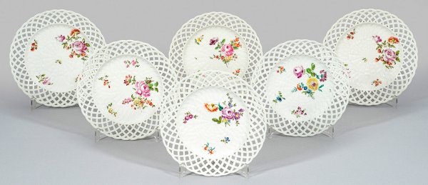 6-tlg.; 4 Teller Wien, 2 Teller Meissen. Runde, leicht vertiefte Form mit gewelltem Rand. Im Spiegel Blumengebinde und Einzelblüten. Korbreliefdekor im Spiegel und flechtartig durchbrochen gearbeitete Fahne. Polychrome Malerei. Unw. rest.; Partiell ber.; Manufaktur- und Schwertermarke. D. 23,5 cm - 24,5 cm.