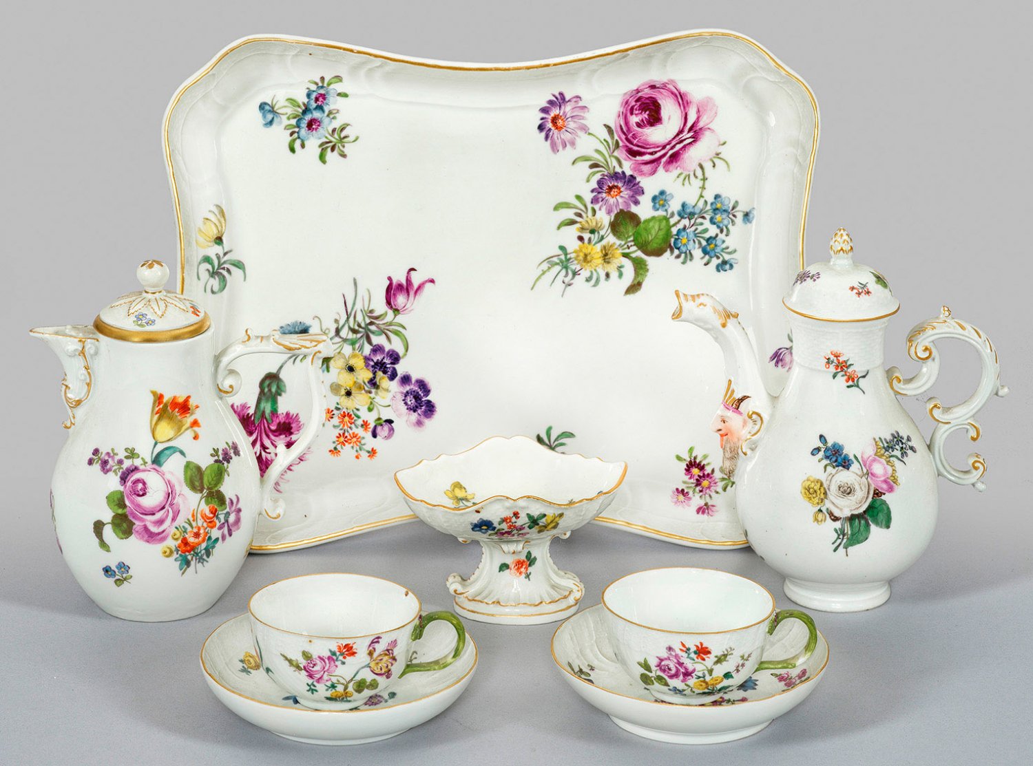 6-tlg.; Zwei Kannen, zwei Tassen mit Untertassen, kleine Zierschale, Tablett. Birnförmiger Korpus mit Maskaron-Schnabelausguss und Rocaillehenkel. Gewölbter Deckel mit plastischem Pinienknauf. Kugelig gedrückte Körper mit Asthenkeln neben reliefplastischen Blüten. Überwiegend Reliefdekor "Alt- und Neuozier". Auf der Wandung und im Spiegel Blumengebinde mit gestreuten Blüten. Polychrome Malerei mit Goldstaffage. Eine Kanne und Deckel passend erg.; Partiell rest.; Teilw. kurzer Spannungsriss. Schwertermarke. Kannen-H. 15 cm -16,5 cm. Tablett 28,5 cm x 22 cm.