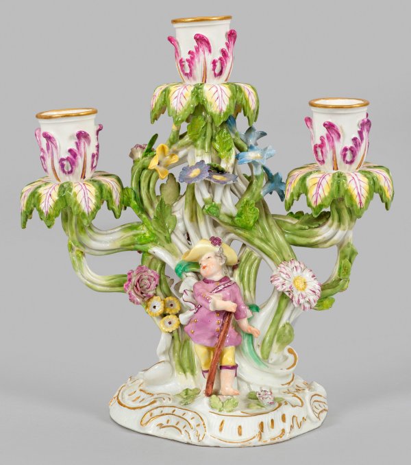 3-flg.; Von reliefierten, goldstaffierten Rocaillen umzogener Sockel mit aufgelegten Blüten und Blättern. Auf vielfach verzweigenden Ästen mit feinplastisch modellierten Blüten, kelchartig aufsteigende Kerzentüllen über blattförmiger Rosette mit Akanthusrelief als Wachsfänger, staffiert in kräftigem Purpur und Grün. Auf der Schauseite in Tanzhaltung stehende, verkleidete Amoretten in Ausgehkleidung. Polychrome Malerei. Entw. Johann Joachim Kaendler, um 1755 - 1760. Rest.; Minim. best.; Schwertermarke. H. 22 cm.