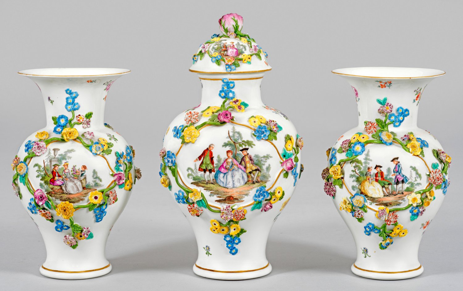 3-tlg.; Auf rundem, eingezogenem Stand balusterförmig ansteigender Korpus mit gerundeter Schulter, in abgesetzten, leicht gekehlten Hals mit profiliertem Rand übergehend. Aufgewölbter Deckel mit Blütenbekrönung. Umlaufend der Wandung und auf dem Deckel die beidseitigen ovalen Kartuschen säumenden und auf der Wandung ausufernden reliefplastischen Blüten, Blätter und damit verbundenen Stengeln. In den schauseitigen Reserven galante höfische Figuren nach Watteau in baumbestandener Parklandschaft. Rücks. und verstreut Blumengebinde und Blüten. Polychrome Malerei mit Goldstaffage. Partiell best./rest.; Schwertermarke. H. 20,5 cm - 26,5 cm.