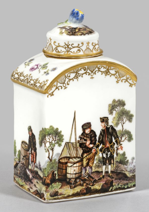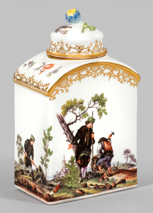 Rechteckiger Korpus mit abgerundeter Schulter und kurzem, zylindrischem Hals. Übergreifender Deckel mit Blütenknauf. Auf der Wandung unterschiedliche Szenen aus dem Leben der sächsischen Bergleute. Auf den Schauseiten in felsiger, baumbestandener Landschaft, neben Fässern stehender Bergbeamter bei der Unterweisung eines Arbeiters mit Holzscheiten sowie beim Schlagen von Erz. Auf den Schmalseiten ein Bergmann beim Verteilen des Gesteinshaufens mit einem Rechen bzw. mit weiterem Werkzeug. Auf dem Deckel in einer Landschaft lagernder Bergmann mit Bergjunge. Die Schulter mit gestreuten Blüten. Feine polychrome und goldkonturierte Malerei, wohl von Bonaventura Gottlieb Häuer (1710 - 1782). Goldspitzenbordüre und Goldrand. Unw. herstellungbed. Brandriss. Unglasierter Boden. H. 13 cm.