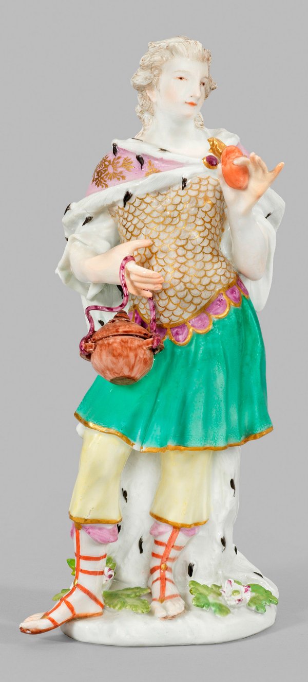 Auf ovalem, mit Blüten und Blättern belegtem Sockel stehender Feldherr in vergoldetem Brustpanzer, einen blütenverzierten Hermelinmantel tragend, in der rechten Hand einen Räucherkessel, in der linken Hand zwei Herzen haltend. Wohl die Allegorie der fürstlichen Liebe verkörpernd. Polychrome Malerei mit Goldstaffage. Entw. Johann Gottlieb Ehder, 1747. Im Boden in purpurfarbener Aufglasur bez. "K.H.C." (Inventarmarke der Königl. Hofkonditorei). Minim. rest.; Schwertermarke. H. 18,5 cm.