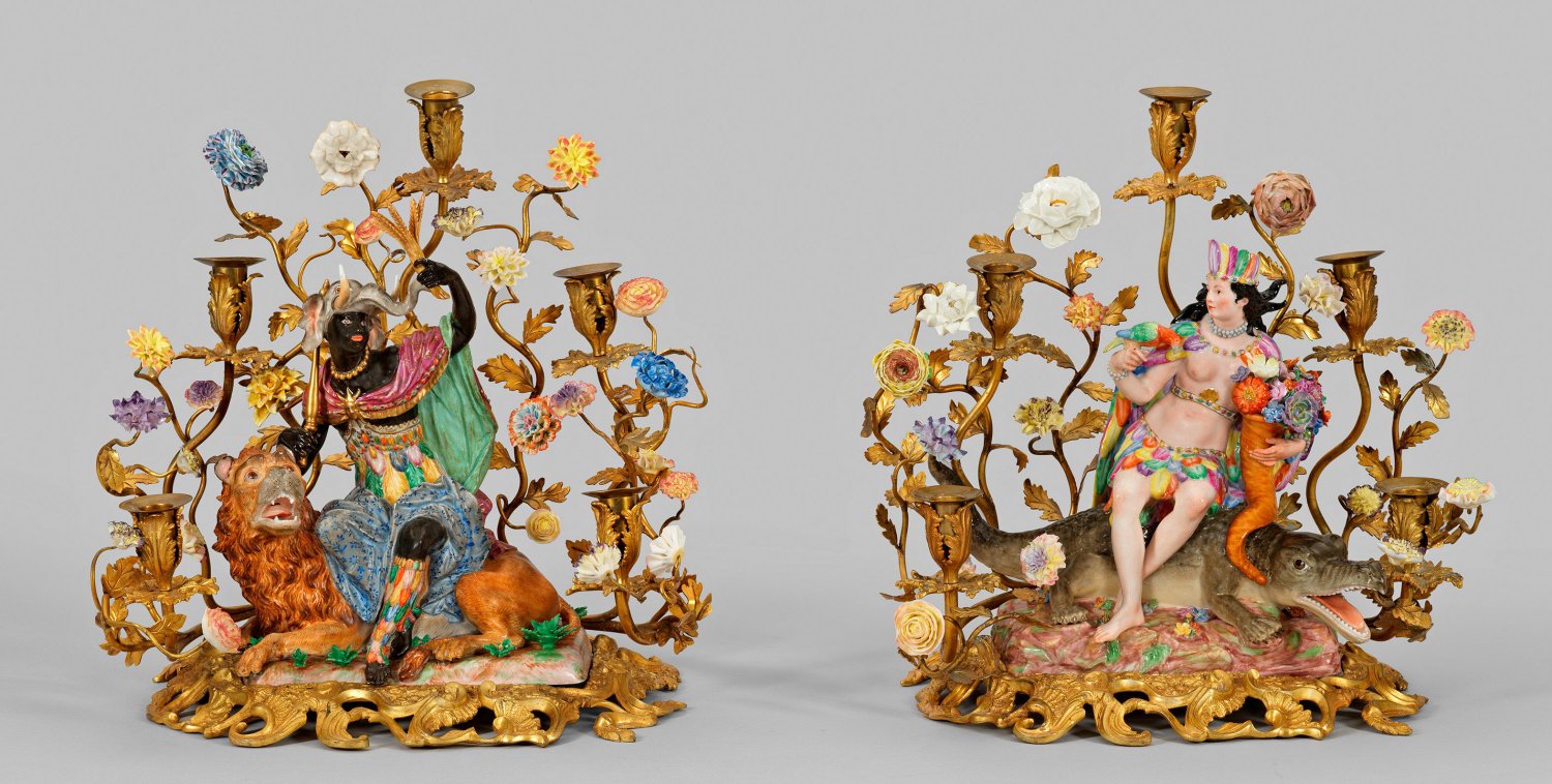 aus der Serie der "Vier Erdteile" für die Zarin Elisabeth Petrowna. Rocailleförmig durchbrochen gearbeiteter, vergoldeter Bronzesockel mit rechteckiger Einlassung für die Figur. Rücks. aufsteigende Blütenzweige mit farbig staffierten, sog. Vincennes-Blüten und fünf kelchförmigen Tüllen mit blattreliefierten Traufschalen. Darin die allegorische Figurengruppe der "Afrika". Auf naturalistischem mit Blüten belegtem Sockel, auf einem Löwen sitzende Afrikanerin in farbenprächtigem Gewand und reich mit bunten Feder geschmücktem Mieder, ihr Haupt bekrönt von plastischer Elefantenhaube. In der linken Hand ein Ährenbündel, in der Rechten ein Zepter haltend. Als Gegenstück die auf einem Krokodil sitzende, von kostbaren Perlen und Juwelen gezierte Indianerin mit bunter Federhaube, Rock und Umhang, in der rechten Hand einen Papageien, in der linken Hand ein Füllhorn haltend, "Amerika" symbolisierend. Polychrome Malerei mit Goldstaffage. Entw. Johann Joachim Kaendler, Johann Friedrich Eberlein und Peter Reinicke. Unw. rest.; Minim. best.; Schwertermarke. Figuren-H. 29 cm - 32 cm. Tafelldekoration 40 cm x 29 cm x 40 cm.