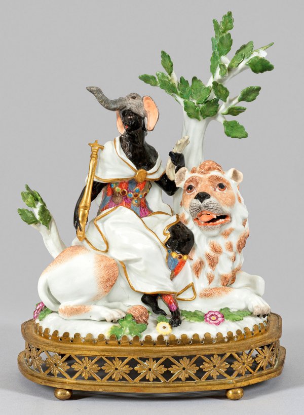 Montiert auf einem floral durchbrochen gearbeiteten Podest im Louis XVI-Stil aus vergoldeter Bronze. Naturalistisch gestalteter, mit plastischen Blüten und Blättern belegter Sockel. Vor einer Baumgruppe auf einem kraftvoll modellierten, in hellen Brauntönen staffierten Löwen sitzende junge, afrikanische Fürstin, den Kopf nach rechts gewandt. Das Haupt bekrönt von einer imposanten, plastisch geformten Elefantenhaube und gehüllt in ein farbenprächtiges Federgewand mit Edelsteinkette, darüber ein knöchellanger Überwurf, der an der Brust mit einer Goldagraffe gehalten wird. In der linken Hand ein Ährenbündel, in der rechten ein goldenes Zepter haltend. Polychrome Malerei mit Goldstaffage. Entw. Johann Joachim Kaendler, 1746. Rest.; Partiell best.; H. 22,5 cm.