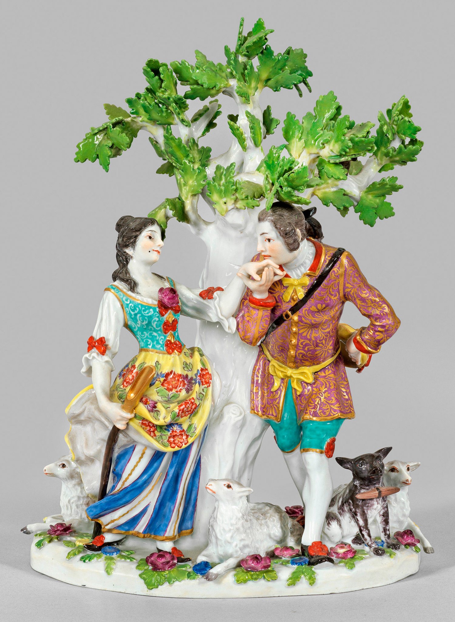 Unregelmäßiger, mit plastischen Blüten und Blättern belegter Sockel. Unter einem Eichenbaum mit darin sitzendem, plastisch ausgeformtem Eichhörnchen stehender, vornehm gekleideter Kavalier, sich vor einer Schäferin verneigend und ihr einen Handkuss gebend. Die Dame, einen Hirtenstab haltend, trägt einen Rock mit Unterrock sowie einen mit Blütenschleifen geknöpften Mieder. Der Herr, gekleidet in einen Gehrock über der Kniebundhose, dazu eine Tragetasche. Den Hut hält er galant hinter dem Rücken versteckt. Zu ihren Füßen liegende Schafe und sitzender Hund als Verkörperung von Treue. Polychrome Malerei (wohl später) mit Goldstaffage. Entw. Johann Joachim Kaendler, 1738. Rest.; Partiell best.; Blasse Schwertermarke. H. 25 cm.